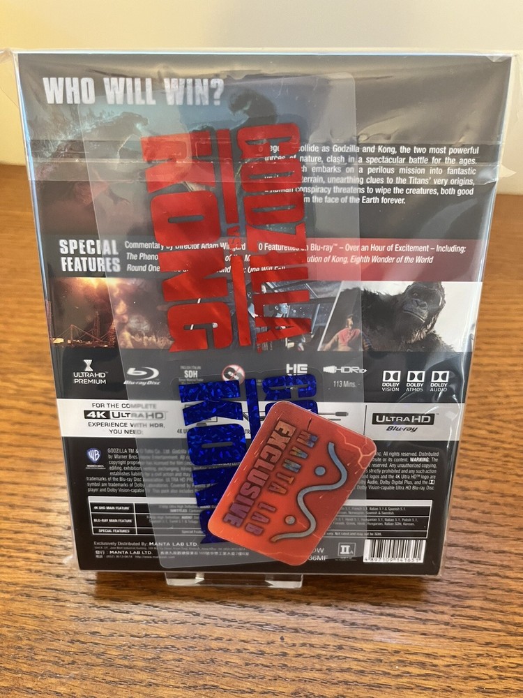 Godzilla Vs Kong Manta Lab full slip 4K UHD & Blu-ray Steelbook NEW & SEALED. Shipped in a box with Bubble Wrap 1000 Units, Numbered 1-1000. WEA, Exclusive Steelcase designed by Manta Lab features "Full Glossy" Finish and "Embossed Title". Full Slip: Spot Foil, Spot Matte, Spot Glossy, Embossing Premiums: Booklet, Postcards, Character Cards, Envelope, Exclusive Numbering Sticker, Exclusive Release Front Sticker, Exclusive Release Lenticular Sticker, Tip On. Special Features: Commentary by Director Adam Wingard / 10 Featurettes on Blu-ray – Over an Hour of Excitement – Including: The Phenomenon of Gōjira, King of the Monsters / The Evolution of Kong, Eighth Wonder of the World Round One: Battle at Sea / Round Two: One Will Fall