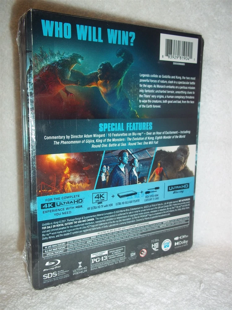 PLEASE READ BELOW BEFORE BIDDING AND ASKING ANY QUESTIONS ITEM DESCRIPTION This 4K/BLURAY is BRAND NEW!! FACTORY SEALED!! NEVER OPENED!! It includes all the original cases, covers, inserts and, of course, the disc(s) itself. Godzilla vs. Kong / Film synopsis Kong and his protectors undertake a perilous journey to find his true home. Along for the ride is Jia, an orphaned girl who has a unique and powerful bond with the mighty beast. However, they soon find themselves in the path of an enraged Godzilla as he cuts a swath of destruction across the globe. The initial confrontation between the two titans -- instigated by unseen forces -- is only the beginning of the mystery that lies deep within the core of the planet. OUR TERMS AND GUARANTEES We will contact the auction winner(s) via email within 24 hours of auction close with any specific instructions that may be necessary to complete the transaction. We will also notify the auction winner(s) when their order has been shipped by sending an email to their ebay email address. WE DO NOT SELL illegal bootleg tapes, copies, screeners, or any type of illegally burned CDs/DVDs! ALL ITEMS ARE FACTORY ORIGINALS and, unless otherwise noted, include their ORIGINAL US factory made cases, inserts/game book and, of course, the items themselves. All DVDs are GUARANTEED. If you receive a damaged, defective or otherwise unusable item from us, please inform us within 15 days of shipment and we will replace the defective product. In the event that the defective item is no longer available, we will substitute for another item, credit your account or issue a refund minus the Shipping. Buyer must make contact within 3 days of the end of auction and payment must be made within 10 days of the end of auction. Please have funds ready to send when you are bidding. Your personal information will never be shared or sold to anyone. Your transaction is strictly confidential, and you will receive your product in discreet packaging . Finally, there should NEVER be a reason to leave us negative feedback. That is NOT the proper way to get our help with a problem, just contact us and give us a chance to provide an appropriate solution. Permanently hurting our reputation by leaving us negative feedback or threatening negative feedback will NOT get you the service you are looking for, again, just email us if you have a problem with your purchase. PAYMENT TERMS Payment is expected within 10 days after the auction closes. Please include the following with your payment: Username Auction number(s) Item name Shipping Address We accept the following forms of payment: . PAYPAL Credit Cards (Contact us for details) SHIPPING TERMS Your DVD(s) will be shipped within 48 hours of receipt of payment. All DVDs will be shipped discreetly . The flat rate shipping fee using USPS FIRST CLASS MAIL is $ 3.00 for the 1st DVD, $2.00 for each additional within the USA . International orders, INCLUDING CANADA, using USPS AIRMAIL are $20.00 for the first DVD, $5 for each additional. Rush and Expedited shipping options are available to most areas; please feel free to contact us for pricing and other details regarding the auction. I COMBINE SHIPPING Please View Our Other Auctions And Save On Shipping Powered by SixBit's eCommerce Solution
