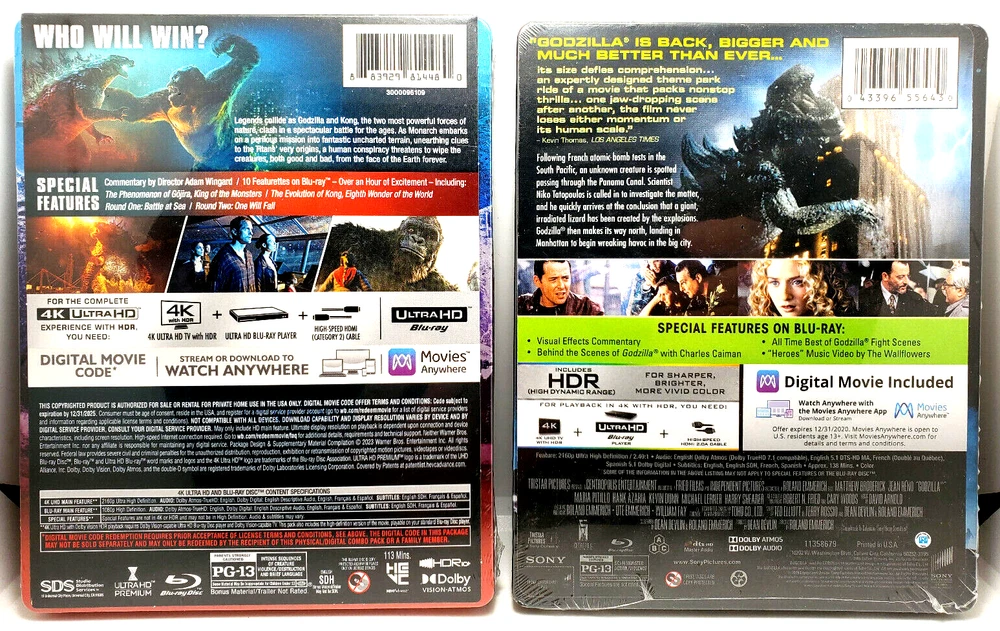 Own: Godzilla Vs. Kong 4K 4K + Blu-ray + Digital Copy Sold-Out Walmart Exclusive Steelbook & Godzilla (1998) 4K 4K + Blu-ray + Digital Copy Sold-Out Best Buy Exclusive Steelbook No dents, no scratches! FACTORY SEALED U.S. RELEASES Ships in a padded box with a tracking number (in the U.S)