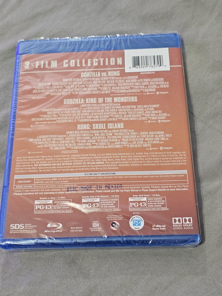 Godzilla vs. Kong is a 2021 American monster film directed by Adam Wingard. Produced by Legendary Pictures and distributed by Warner Bros. Pictures, it is a sequel to Kong: Skull Island (2017) and Godzilla: King of the Monsters (2019), and is the fourth film in the Monsterverse. Godzilla: King of the Monsters is a 2019 American monster film directed and co-written by Michael Dougherty. Produced by Legendary Pictures and distributed by Warner Bros. Pictures, it is a sequel to Godzilla (2014) and the third film in the Monsterverse. Kong: Skull Island is a 2017 American monster film directed by Jordan Vogt-Roberts. Produced by Legendary Pictures and distributed by Warner Bros. Pictures, it is a reboot of the King Kong franchise and the second film in the Monsterverse, serving as the 11th film in the King Kong franchise. Brand New Sealed In english, french and spanish Region A ntsc Shipping in Canada and USA only I don't combine shipping