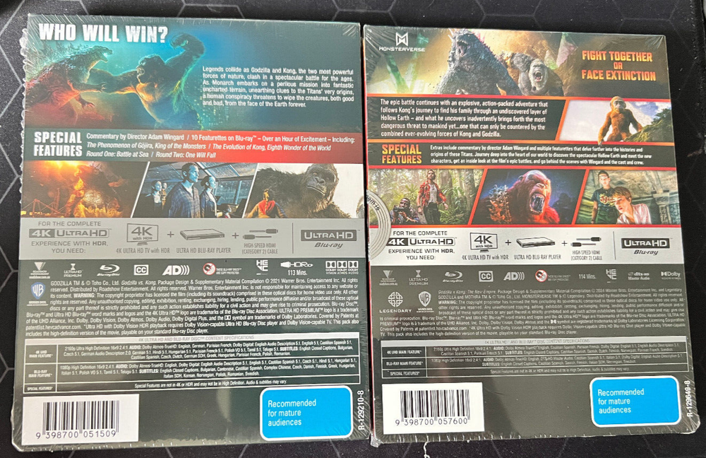 Participate North Film Godzilla Vs Kong (Steelbook 4K Blu-Ray ) Godzilla X kong (Steelbook 4K Blu-Ray) This is a Region B Blu-Ray. Please ensure you player can play Region B Blu-Ray Item is Brand New and Sealed Shipping and Delivering All our products are shipped via Australian Post. Our shipping price includes careful and secure packaging, ensuring your item arrives safely with FAST shipping & protective bags & this is a FREE postage service Return Policies Returns accepted within: 7 Days with item in it's original seal and undamaged Return shipping paid by: Buyer Refund given as: Money Back via PayPal or Bank Deposit When you purchase this item you agree this is a Region B Blu-Ray. Incorrect regions are non-refundable. Please ensure your player is able to play Region B Blu-Ray No returns or refunds for international buyers It is the buyers responsible for paying for any of their taxes or other fees in their country, region or town. Click For More Titles