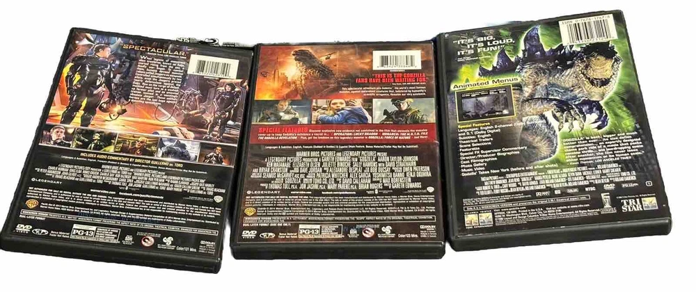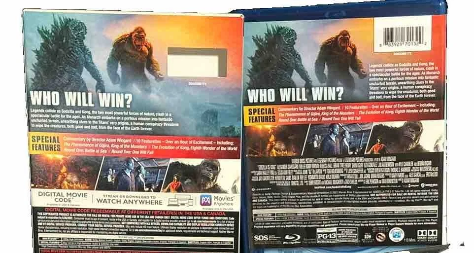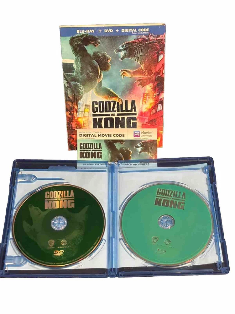 Lot of 4 Godzilla vs Kong (Blu-ray DVD) Godzilla DVD Godzilla DVD Pacific Rim DVD Experience the epic battle between two iconic monsters in the action-packed Godzilla Vs. Kong movie. This Blu-ray edition comes with a special slipcover and three additional Kaiju DVDs from the Pacific Rim franchise. Directed by Adam Wingard, this PG-13 rated film features Millie Bobby Brown and Bryan Cranston as they take on the roles of young woman and scientist respectively. The movie is presented in English language with commentary feature and falls under the categories of Blu-ray and DVDs & Blu-ray Discs. The genre encompasses futuristic, action, adventure, sci-fi & fantasy, children's & family, post-apocalyptic, thriller & mystery, fantasy, comedy, and action & adventure. Get ready to witness the battle of the century between Godzilla and Kong in this standard edition Blu-ray format.