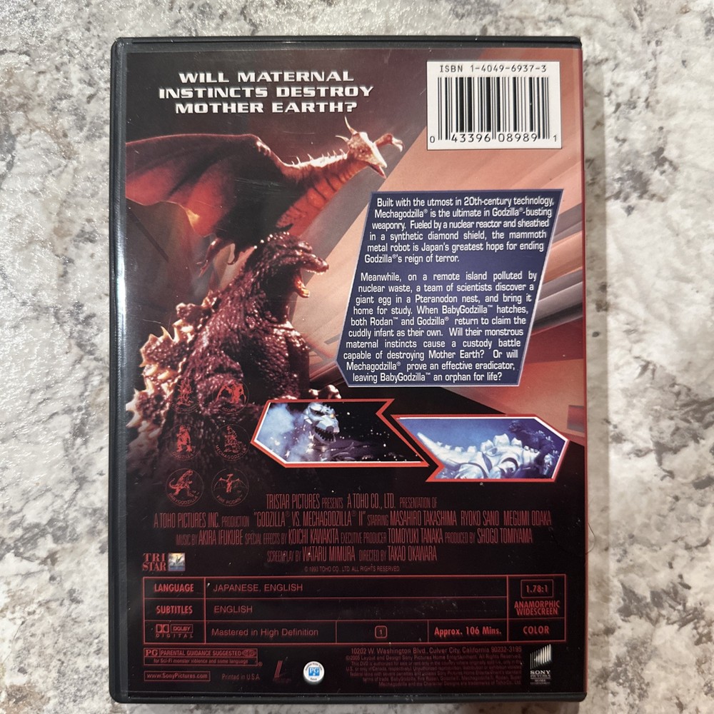"Godzilla Vs Mechagodzilla II" is a science fiction movie released on DVD in 1993. Directed by Takao Okawara and produced by David Bernstein, Echo Gaffney, Randy Mack, and Tom Roy, the film has a PG rating and a run time of 106 minutes. It is in Japanese and English with English and French subtitles. The DVD is from Sony Pictures.