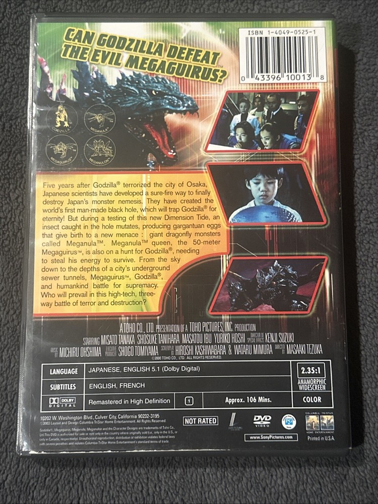 This is the second Godzilla of the Millennium Series, Godzilla Vs Megaguirus. This is a dvd that allows you so switch languages. You can watch it in Japanese with English Subtitles or you can watch it dubbed in English. In this movie, a reboot that is a sequel to the original 1954 movie Godzilla but ignores the rest of the Showa Series and the Heisei Series too, it even ignores Godzilla 2000, Godzilla returns and causes havoc again in Japan. But a swarm of vicious mutant dragonfly monsters starts invading all of Japan ruled by their queen, Megaguirus. Godzilla must defeat Megaguirus at all costs. If you have any questions, please feel free to message me. Thank you. Also feel free to make an offer on this item as well and I will decide if it is acceptable or not. Thank you.