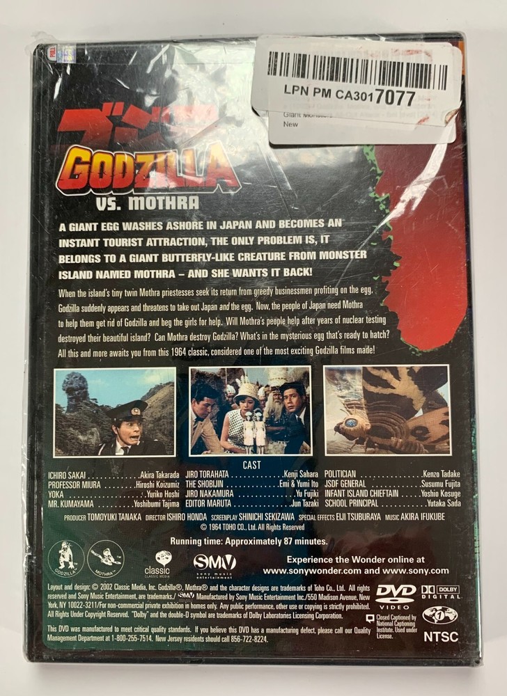 Godzilla Vs. Mothra DVD "More visually splendid and imaginatively written than the other Godzilla sequels, this (the fourth in the series) starts when Mothra's gigantic egg washes ashore in Japan, having been dislodged from Mothra Island by a hurricane. Two tiny twin girls (sometimes singing like dual-diminutive Dorothy Lamours) from the island come to plead for the return of the egg by the greedy business guys who bought it for a tourist attraction, but to no avail. Radiation from nuclear testing revives Godzilla from the earth, who proceeds to threaten the egg and the cities, unless Mothra and his larvae hatched from the egg can stop him. The battle sequences between Mothra and Godzilla, and between Godzilla and the larvae, are spectacularly vivid and colorful. --Jim Gay" Sealed - plastic is ripped in spots. Has an LPN sticker - looks to be a return Found in an Undelivered Mail Mystery Box!