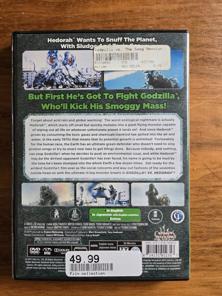 Embark on a thrilling journey with "Godzilla Vs The Smog Monster" on DVD, a classic addition to any Kaiju enthusiast's collection. This captivating action flick from 1971 brings the legendary monster to life with gripping encounters and a cult-following for its B-Movie charm. Featuring the talents of Hiroyuki Kawase and Akira Yamauchi, this Standard Edition DVD presents the movie in its original 2.35:1 aspect ratio, ensuring viewers experience it as intended. Crafted with care, this DVD offers both English and Japanese audio options, complete with subtitles in English for an inclusive viewing experience. Rated PG, this film is suitable for a wide audience, eager to dive into the depths of disaster and monster sub-genres. Whether you're revisiting this Kraken Releasing studio gem or discovering it for the first time, prepare for an unforgettable adventure.