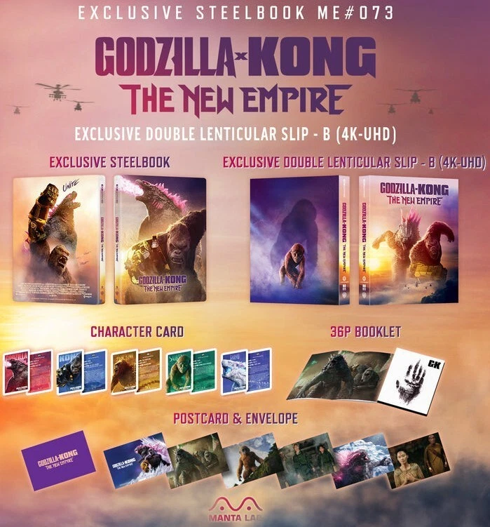 This is for a new & sealed Godzilla X Kong: The New Empire Double Lenticular B SteelBook from Manta Lab. This includes a 4K and a Blu-ray disc. This is number 108/1000. This is sealed so I don't know if there are any imperfections on the Steelbook. The last image is an example of what is inside the slip and Steelbook. Keep in mind that eBay now charges tax in most states. Due to ebay's new payments system I will have to wait until the payment clears before I ship this out. Please be aware that this is ebay's doing and not mine. Sorry for any inconvenience. I am selling other movies so please check my other listings.