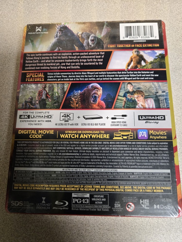 Dive into the epic adventure with "Godzilla X Kong: The New Empire" now available in a stunning 4K UHD Blu-ray format, complete with a sleek Steelbook case. Fans of action, adventure, and fantasy will revel in the high-definition experience of this gripping tale, featuring an ensemble cast including Dan Stevens, Rebecca Hall, and Brian Tyree Henry. Enjoy the convenience of a region-free disc, allowing you to play no matter where your travels take you. With a run time of 1 hour and 55 minutes, this movie is perfect for an evening's entertainment or a weekend movie marathon. The package includes English subtitles, ensuring you catch every thrilling moment. Directed by Adam Wingard and produced by Warner Bros, this Steelbook edition is a must-have for collectors and enthusiasts alike.