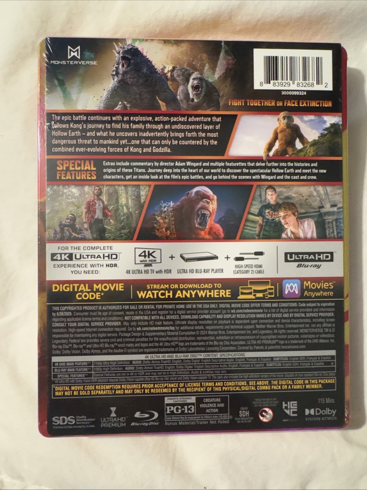 Experience the epic battle for supremacy in the Monsterverse with "Godzilla X Kong: The New Empire" on 4K UHD Blu-ray, now available in a stunning Steelbook case edition. Directed by Adam Wingard and featuring an electrifying performance by Brian Tyree Henry, this action-packed adventure will take you on a journey through a world where giants clash and legends are forged. This region-free set includes two discs, with the first disc dedicated to the movie's vivid visual spectacle in high-definition and the second disc filled with exclusive behind-the-scenes featurettes. Enjoy the movie in English with optional subtitles and immerse yourself in the fantasy, sci-fi, and adventure that "Godzilla X Kong: The New Empire" has to offer.