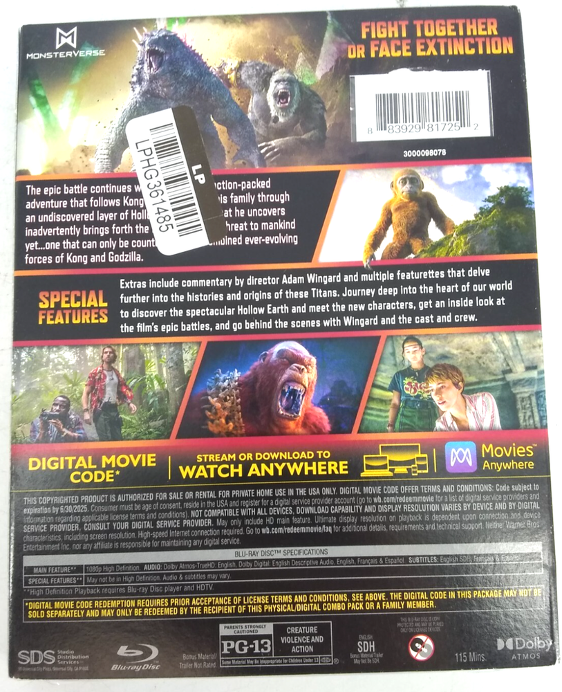 The epic battle continues! The cinematic Monsterverse follows up the explosive showdown of “Godzilla vs. Kong” with an all-new adventure that pits the almighty Kong and the fearsome Godzilla against a colossal undiscovered threat hidden within our world, challenging their very existence—and our own. “Godzilla x Kong: The New Empire” delves further into the histories of these Titans and their origins, as well as the mysteries of Skull Island and beyond, while uncovering the mythic battle that helped forge these extraordinary beings and tied them to humankind forever. FEATURES: 4K Ultra HD MPAA Rating: PG-13 Genre: Action, Adventure, Sci-Fi Godzilla x Kong: The New Empire ~ Blu-ray + Digital