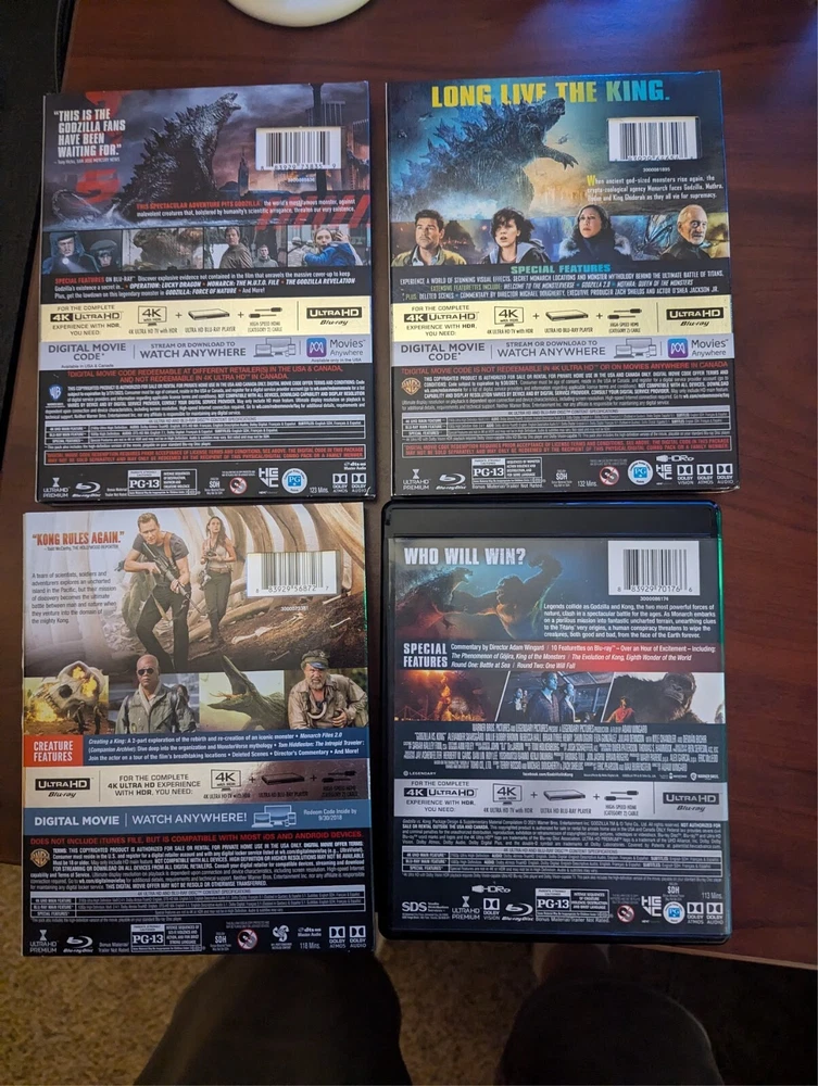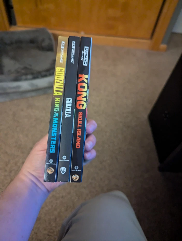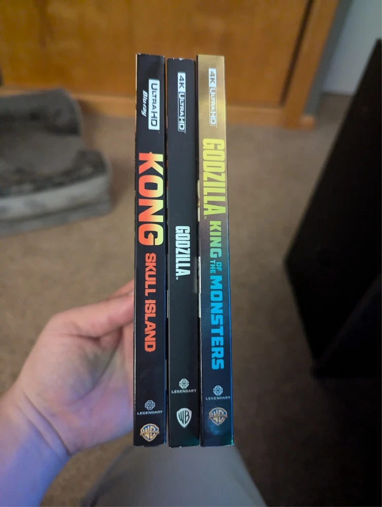 Up for sale is lot of 4 Godzilla and Kong movies on 4K UHD + Blu Ray. No Digital codes Kong Skull Island has the slip cover. It also has the 3D Blu-Ray includes as can be seen in the pic. Godzilla has the slip cover Godzilla King of Monsters also has the slip. No slip on the Godzilla VS Kong.