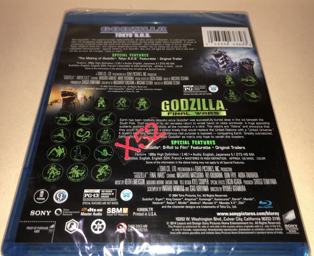 Offering the OFFICIAL release BLU-RAY double feature set: GODZILLA TOKYO S.O.S. GODZILLA FINAL WARS Questions welcome / More GODZILLA MOVIEs CDs TOYs in OUR ebay store https://www.ebay.com/str/X-52-STORE?_trksid=p2047675.l2563 Reduce shipping with another purchase from our store