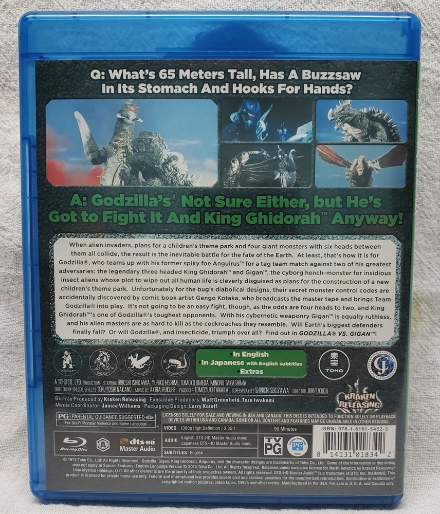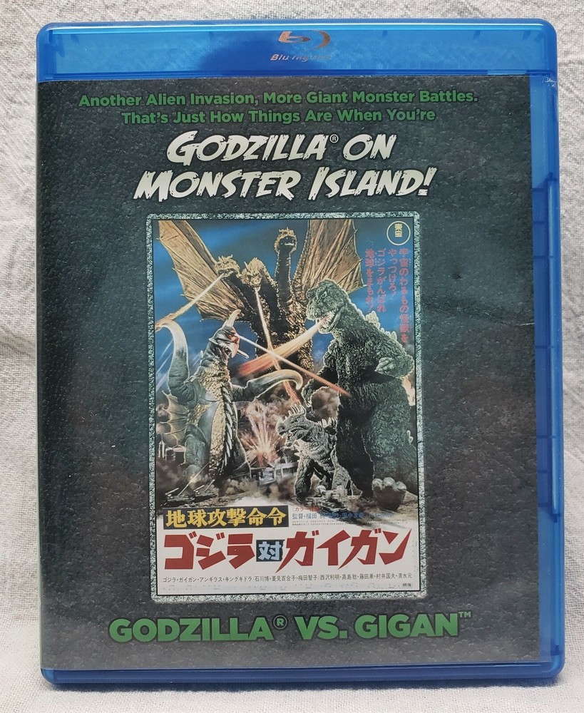 Godzilla on Monster Island Godzilla vs. Gigan (Blu-ray Disc, 2014) OUT OF PRINT. Condition is "Like New". When alien invaders, plans for a children's theme park and four giant monsters with six heads between them all collide, the result is the inevitable battle for the fate of the Earth. At least, that's how it is for Godzilla, who teams up with his former spiky foe Anguirus for a tag team match against two of his greatest adversaries: the legendary three headed King Ghidorah and Gigan the cyborg hench-monster for insidious insect aliens whose plot to wipe out all human life is cleverly disguised as plans for the construction of a new children's theme park. Unfortunately for the bug's diabolical designs, their secret monster control codes are accidentally discovered by comic book artist Gengo Kotaka, who broadcasts the master tape and brings Team Godzilla into play. It's not going to be an easy fight, though, as the odds are four heads to two, and King Ghidorah's one of Godzilla's toughest opponents. With his cybernetic weaponry Gigan is equally ruthless, and his alien masters are as hard to kill as the cockroaches they resemble. Will Earth's biggest defenders finally fall? Or will Godzilla, and insecticide, triumph over all? Find out in Godzilla VS Gigan