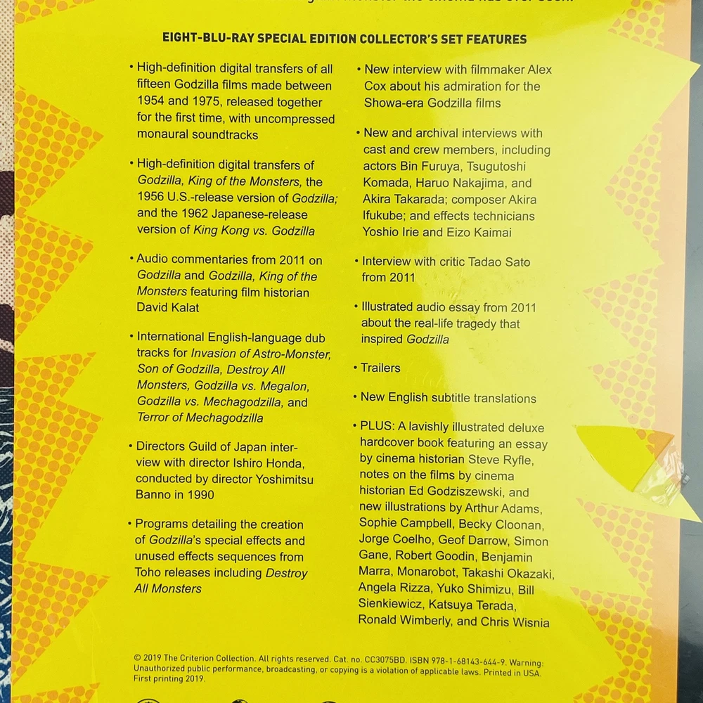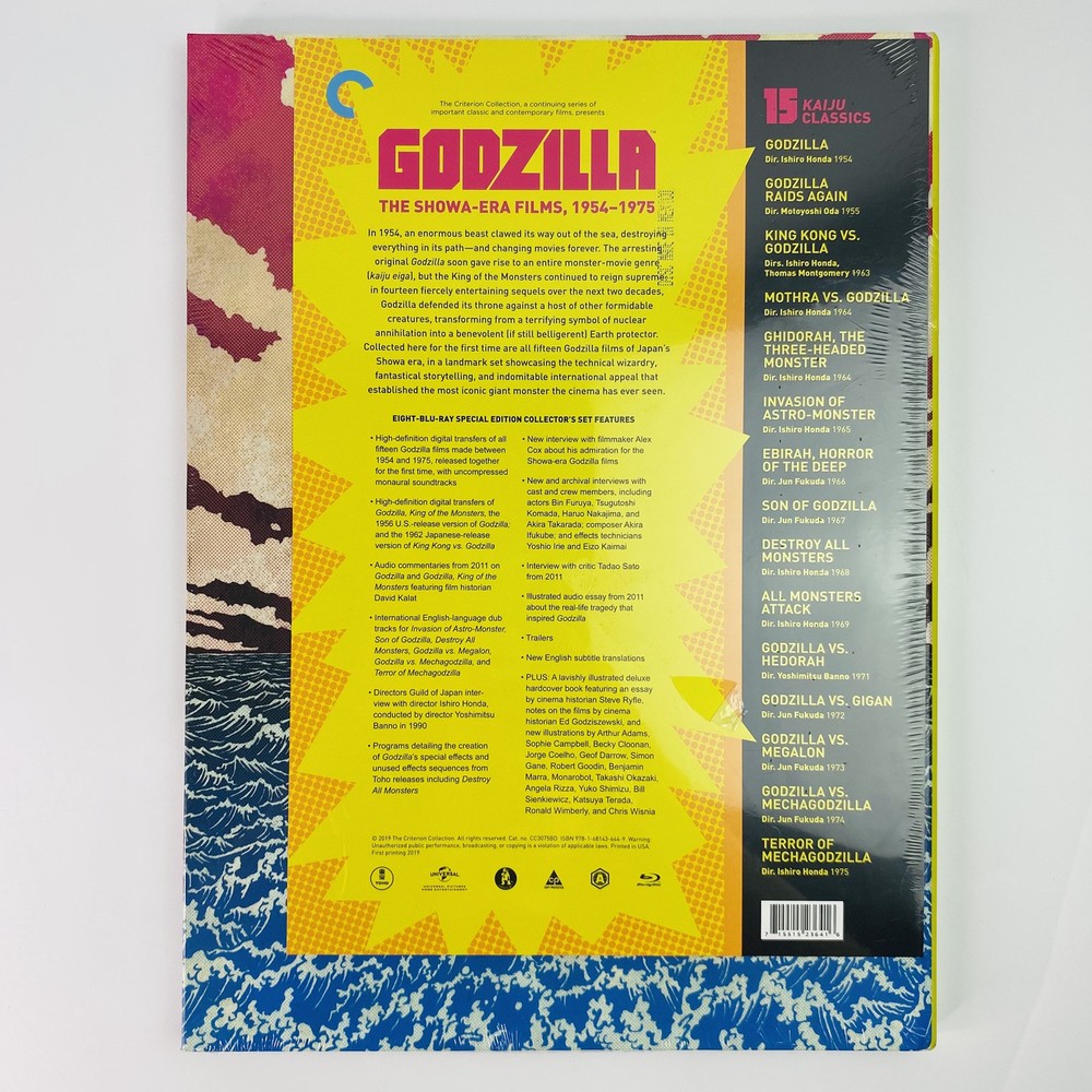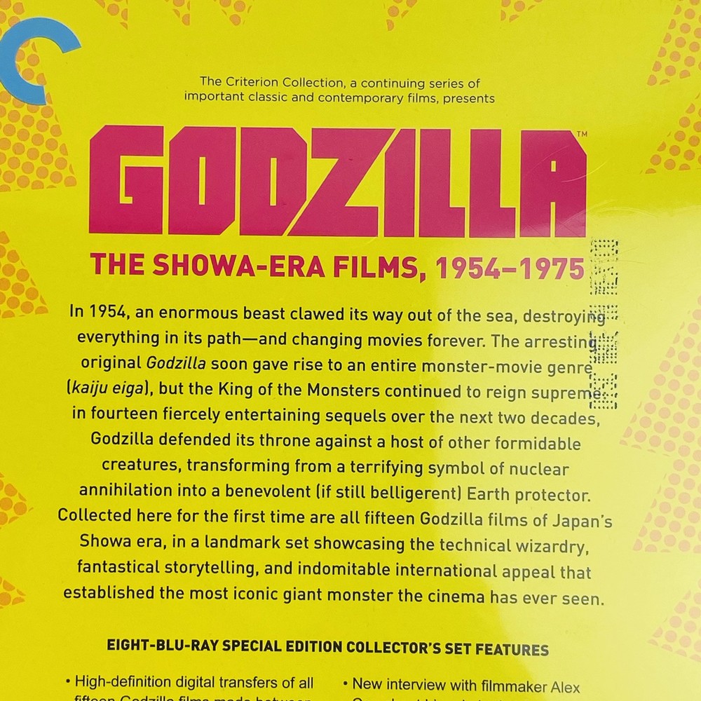 Godzilla: the Showa-Era Films 1954-1975 Blu Ray Criterion Collection Book Set Please see photos for condition Has some minor tears in wrapping Spine has some black marking/ wear Check out my store for more Godzilla collectibles and other awesome collectibles!