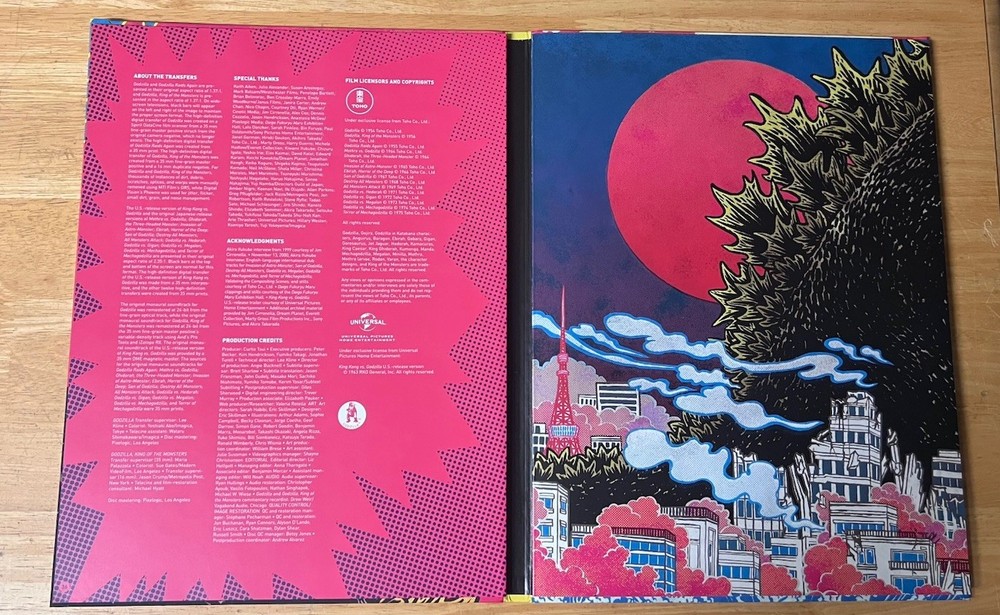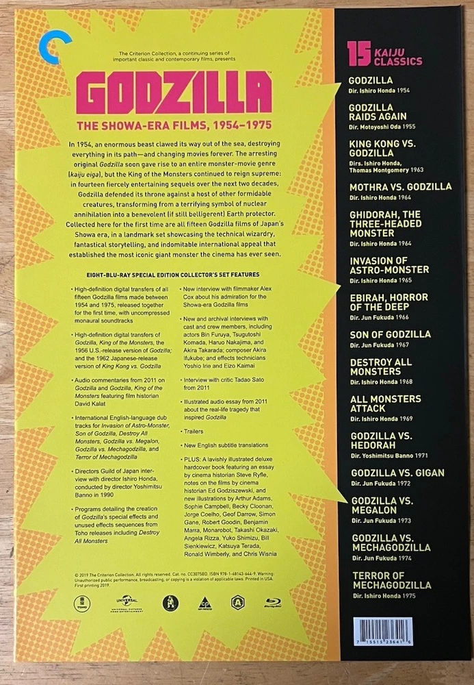 The "Godzilla: the Showa-Era Films 1954-1975 Criterion Collection Blu-ray" is a collection of classic Godzilla movies from the Showa era, which includes films released between 1954 and 1975. This Blu-ray set includes iconic titles such as "Gojira" and "Toho" and presents them in high-definition quality. With a focus on horror and science fiction, this collection is a must-have for fans of the legendary monster Godzilla and provides an in-depth look at the early years of the franchise. Only played two of the disc once. The book is like new condition as I never read the contents of the pages. The disc are held in a hard cover bound book. Also the outer page I kept that has the movie list.