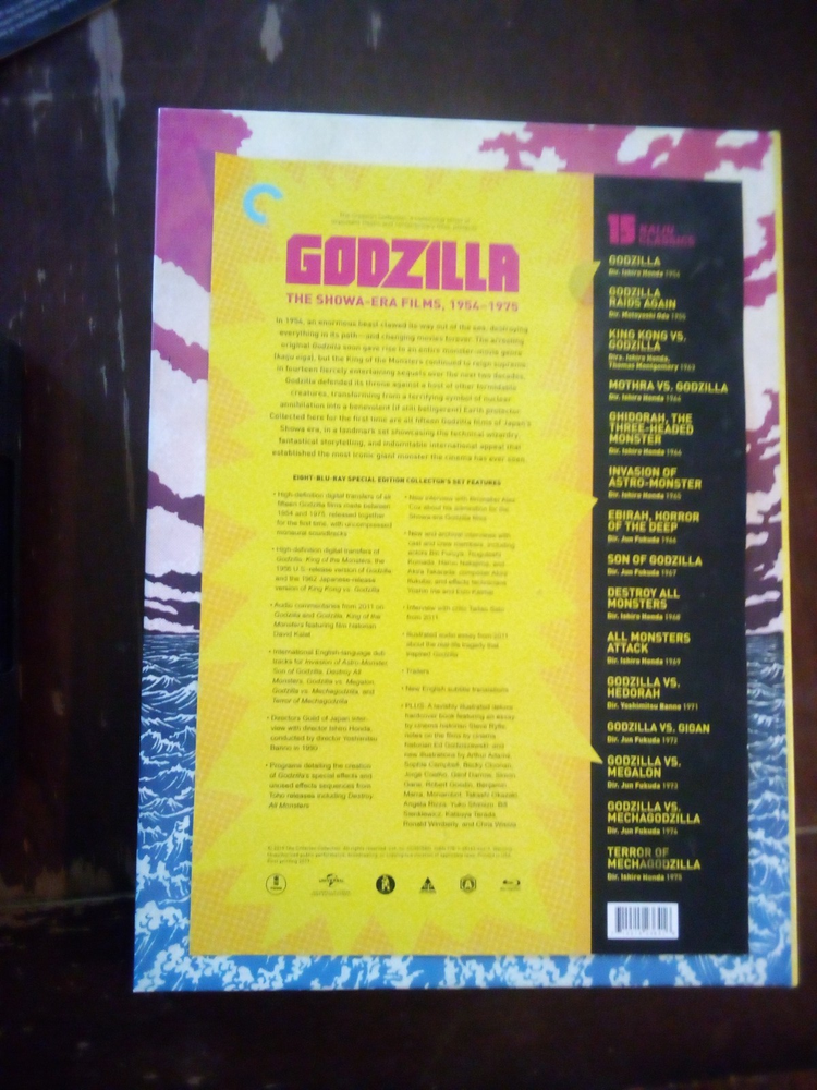 This is for a like new copy of the Godzilla Showa Era Criterion Collection blu-ray set, played once. I removed the discs from the packaging and placed them in a multi-DVD case when I got my copy because I'd heard the glue was separating on the box. Your discs will arrive in the DVD case and you will also receive the Criterion package. Discs are in perfect shape (see photos). From a non-smoking home.