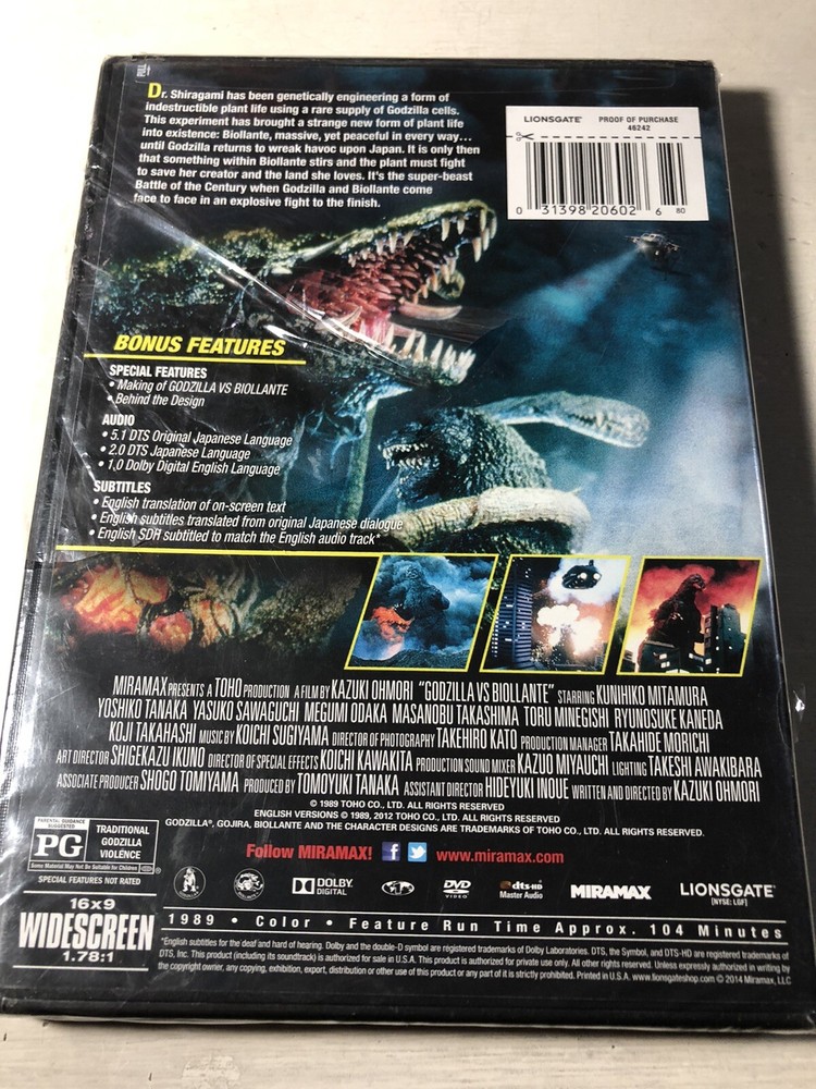 Godzilla vs. Biollante (1989) DVD NEW Fantasy Monster 2014 Miramax Release. Condition is “Brand New”. Shrink wrap is tearing on side of case as pictured, still sealed. Shipped via USPS Media Mail. After the devastation of Godzilla's resurgence, a miniature arms race ensues to collect his cells. The cells are obtained by the middle eastern nation of Saradia, where geneticist Genichiro Shiragami is tasked to study them. However, the cells are sought by various groups leading to a terrorist attack that kills Dr. Shiragami's daughter Erika. As Shiragami retreats into isolation, the Japanese government sets it's sights on developing a bio weapon countermeasure against Godzilla should the monster ever be freed from its volcanic tomb. They enlist the aid of Dr. Shiragami, who's experiments result in a monstrous new mutation. Discounted combined shipping on records, cassettes, CDs, DVD, Blu-ray, VHS. To combine shipping add items to your cart and request an invoice. All media is shipped in boxes for protection.