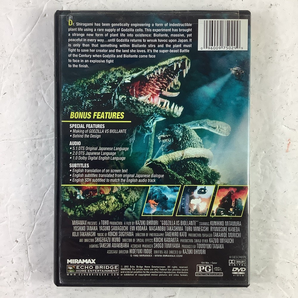 This rare and highly sought-after DVD features the epic battle between Godzilla and Biollante. The film, released in 2012, is presented in NTSC video format and comes in a tall/DVD case. It has a PG rating and is classified as an action genre. The DVD is in Region Code 1 (US, Canada...) and features both English and Japanese language options. This classic movie from the MIRAMAX studio is a must-have for fans of the Godzilla franchise and collectors of rare DVDs. Get your hands on this out-of-print treasure today!