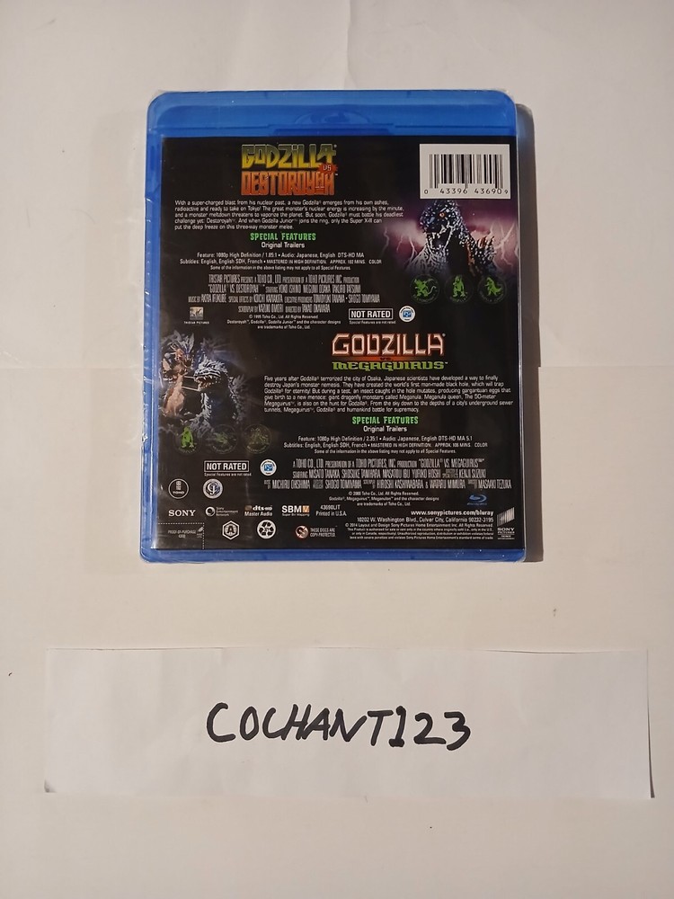 Brand new and sealed, this Bluray set includes two thrilling Godzilla films - "Godzilla vs. Destoroyah" and "Godzilla vs. Megaguirus." Released by Sony Pictures in 2014, the discs are in NTSC format with a total runtime of 209 minutes. Perfect for fans of sci-fi and contemporary monster movies, this Region A Bluray is a must-have addition to any collection.