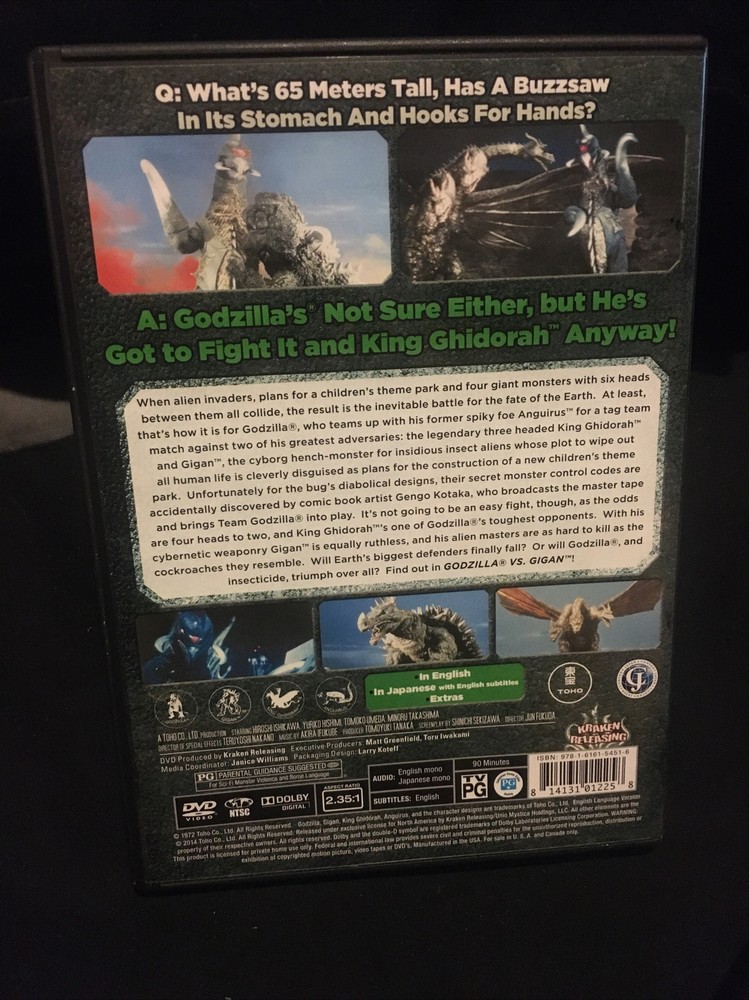 Godzilla vs. Gigan (DVD, 2014). Condition is "Good". Shipped with USPS media mail Dvd, cover art and case included. Dvd looks good with just a few light scratches. Dvd guaranteed to play like new or returns always welcome. Dvd case looks good also with just a little sticker residue on it.