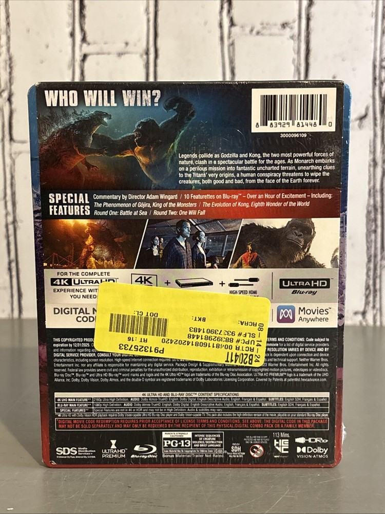 The product is a limited edition 4K Ultra HD Blu-ray Steelbook of the movie "Godzilla vs. Kong," released in 2021. The film falls under the genres of action and adventure, with a sub-genre of creatures/monsters and mystery. It has a PG-13 rating and is in English with English subtitles available. The Blu-ray is region code A, which is suitable for the Americas and Southeast Asia. This edition includes both the Blu-ray disc and a digital copy of the movie. Thanks for looking be sure to check out our store C & C Junk