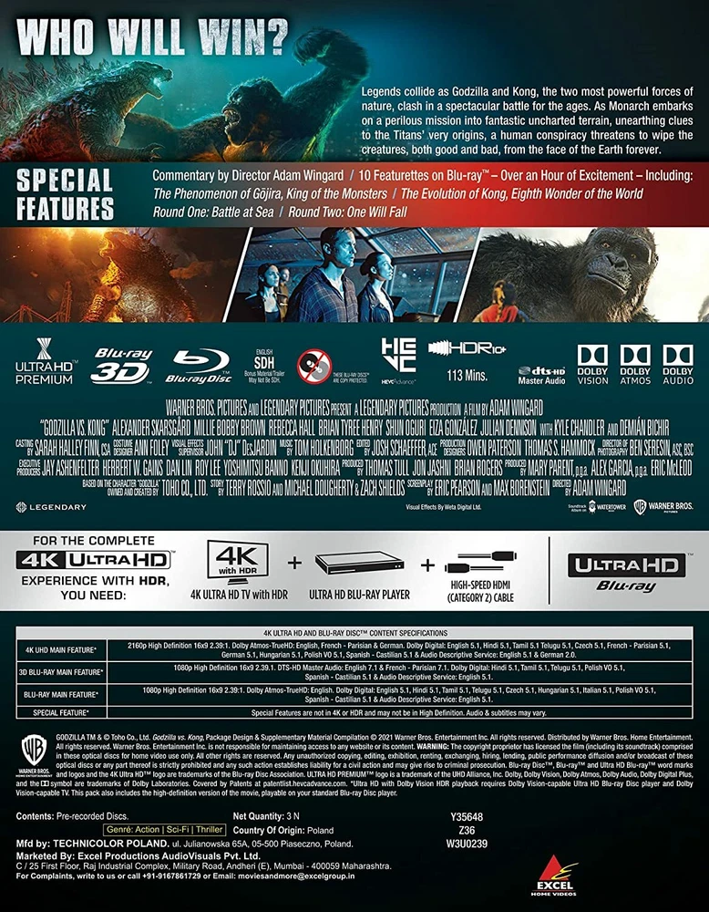 **********PLEASE READ WITH CARE********* THIS IS A BRAND NEW STEELBOOK COLLECTION OF GODZILLA VS KONG STEELlBOOK (4K Ultra BLU-RAY+ 3D Blu-Ray+ Blu-ray ) 3 DISK STEELBOOK THIS IS A INTERNATIONAL RELEASE REGION FREE MEANING THAT THESE DISK'S WILL WORK ON ANY 4K AND 3D BLU-RAY PLAYER PLEASE LOOK AT THE PICTURES WHAT YOU SEE IS WHAT YOU WILL RECEIVE THIS STEELBOOK IS BRAND NEW NOT OPEN OR VIEWED THE STEELBOOK BOX SET IS FACTORY SEALED I SHIP THE SAME DAY IF THE ORDER IS MADE BEFORE 2PM EASTERN TIME THIS ITEM WILL BE SHIPPED WITH CARE IN A WELL SEALED BUBBLE WRAP MAILER I SHIP AS IF I WAS GOING TO ORDER IT MY SELF *****NOTE I ACCEPT RETURNS UNDER THE CONDITIONS***** *****ARE STILL NEW IN ITS ORIGINAL WRAPPING***** *****AND ITS NOT DAMAGE IN ANY WAY***** *****I GUARANTY THIS ITEM TO***** *****BE SHIPPED VERY SPECIAL***** DO NOT HESITATE TO ASK ANY QUESTION THANK YOU Description At a waystation in a remote desert, Will (Winston Duke), an arbiter, interviews prospective souls for rebirth. The sudden death of Will's most treasured soul, Amanda, upends his fragile, unusual existence, as numerous candidates vie to occupy the space Amanda left behind. As Will grapples with his grief and struggles to choose between two finalists--Kane the cynic (Bill Skarsgård) and Emma the empath (Zazie Beetz)--he must ultimately confront his own arrested existence if he is to achieve catharsis. Written and directed by Edson Oda.~Maggie Sadler Genre Action and Adventure,Sci-Fi Subgenre Creature Film,Sci-Fi Action,Sci-Fi Adventure Title Godzilla vs. Kong Countries Produced Australia Duration 113 minutes Year of Release 2020 Product Tags SteelBook 4K Ultra HD Blu-ray/3D Blu-ray, Blu-ray Format 4K Ultra HD Blu-ray, Blu-ray, 3D Blu-ray Program Type Movie Studio Warner Home Video