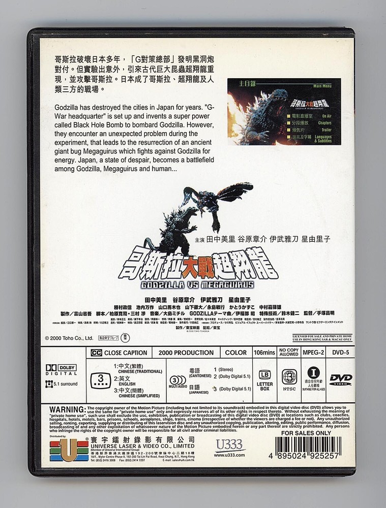 Rare 2000 Hong Kong DVD release of Japanese Kaiju film, Godzilla vs. Megaguirus. Presented in Japanese 5.1 Surround Dolby Digital as well as dubbed Cantonese 5.1 Surround Dolby Digital & Stereo. Removable subtitles in English, Traditional Chinese and Simplified Chinese. Letterbox format. Disc in excellent shape. No scratches or fingerprints. Plays perfectly. Attractive laser etching. Cover has very minor scuffs due to storage but cover slipsheet in excellent condition. Please see photos for more detail. • DVD is Region 3 and can only be played on region free players *