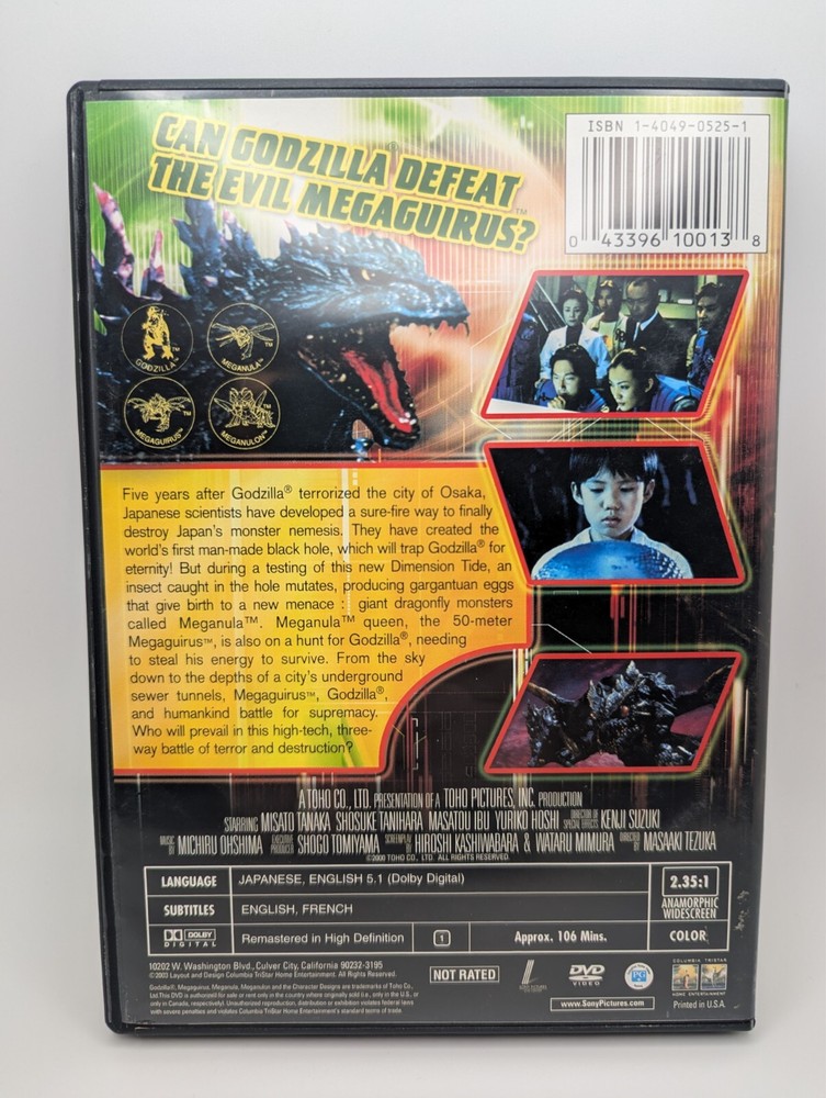 Godzilla vs Megaguirus, good clean copy. This DVD features the epic battle between Godzilla and Megaguirus, directed by Masaaki Tezuka. The film stars Yuriko Hoshi, Misato Tanaka, Shosuke Tanihara, and Masatou Ibu, and is part of the Godzilla franchise. The DVD is in the DVD: 1 (US, Canada...) format, with a run time of 106 minutes. The features of this DVD include widescreen format and subtitles in English and French. The genre of the movie is Sci-Fi-Contemporary, with a Sub-Genre of Horror-Monsters. The studio behind the movie is Sony Pictures, and it was released in 2000. This DVD is a Standard Edition, and is perfect for fans of the Godzilla franchise and horror movies. If you have any questions let me know, what you see in the pictures is what you get. Thank you.