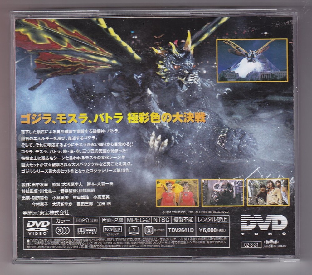 Used import DVD. Check my other auctions for more Godzilla, Gamera, Ultraman and Kamen Rider. Complete includes inserts and OBI. This is the first DVD release of this movie in Japan. 3 Audio Tracks Audio: Japanese (original), Japanese (2002 Remix), Japanese (Commentary) Optional Subtitles: Japanese Tons of behind the scenes footage A Behind the scenes fight scene between Godzilla Mothra Battra that uses the Angle function to swap between camera footage on each monster. Music Video/Sizzle Cut of the Twins singing Mothra song. Movie Program as an image gallery and tons of other promotional art galleries Godzilla vs Mothra trailer that also shows vs Biollante and vs King Ghidorah Lots more Godzilla vs Mothra trailers TV spot that ends w/ Bandai Toys. And More... Godzilla vs. Mothra ( ゴジラvsモスラ Gojira tai Mosura ? ) is a 1992 Japanese science fiction kaiju film produced byToho Co., Ltd.. Directed by Takao Okawara with special effects by Koichi Kawakita, the film stars Tetsuya Bessho,Satomi Kobayashi and Akiji Kobayashi. The 19th installment in the Godzilla series, unadjusted for inflation the film remains the highest grossing film of the entire Godzilla series. After the success of the previous year's Godzilla vs King Ghidorah, Toho decided to bring back Mothra, their second most famous creation. Composer Akira Ifukube won a Japanese Academy Award for his score. The film was the second highest grossing film in Japan in 1993, second only to Jurassic Park. The film was released direct to video in the United States in 1998 by Columbia Tristar Home Video as Godzilla and Mothra: The Battle for Earth. Plot The Cosmos tell of an ancient, advanced civilization that tried to control the earth's climate. In return, the earth created Battra. Battra became uncontrollable, and started to harm the very planet that created it. Mothra, another earth protector, fought a fierce battle with Battra, who eventually lost. However, in the course of the battle, the civilization was destroyed. Mothra retired to Infant Island, and Battra the Northern Sea. Due to recent disasters, Mothra's egg has been uncovered, and the Cosmos fear that Battra has awoken as well.A large meteor hurtles towards earth, lands in the ocean and awakens Godzilla. One particularly large typhoon is monitored over the Pacific ocean. The next day, a young man named Takuya Fujita is detained after stealing an ancient artifact. Later, a representative of the Japanese Prime Minister arrives with Takuya's ex-wife, Masako Tezuka, and offers him to explore an island with Masako and Marutomo company secretary, Kenji Ando, and become a free man. Takuya initially turns down the offer, on the basis that he is to be released in another week. But after his ex-wife informs him that his sentence has been reconsidered, he accepts. After the trio arrives at the island, they find a cave behind a waterfall. Inside, they discover ancient paintings, including a picture of two giant insects fighting one another. While studying them, the sun shines through a hole in the wall, and the light points to a small opening in the cave, where they come upon a giant egg. The three hear a pair of voices, which belong to the Cosmos. They keep the earth's natural order in balance, and informs them the egg belongs to Mothra. Meanwhile, Japanese forces try to stop Battra's invasion, but fail. Makoto then orders a freighter sent to Infant Island to pick up the egg, planning to exploit it. Ando explains to Masako and Takuya that, contrary to Takeshi's true intentions, he intends to protect the egg, and the Cosmos agree to let him take it. As they are sailing, Godzilla surfaces, and heads toward the egg. The egg then hatches, and a Mothra larvae crawls out. The two begin fighting. Battra soon appears and joins the fight, with Mothra caught in the middle. Mothra finally gets a chance at escape, and takes it. The battle between Godzilla and Battra is eventually taken underwater, where the force of the battle causes a giant crack in the ocean's floor that swallows the two. After the ordeal at sea, Takuya, Ando, Masako, and the Cosmos stay overnight at a hotel. While Ando is drinking, Masako and Takuya have a discussion about the day's events, and about their history together. Masako awakens to discover that the Cosmos have gone missing, and immediately wakes up Takuya, who immediately realizes that Ando took them back to Takeshi. The two take a flight back to Tokyo, where Masako meets up with their daughter, Midori, her sister, Mayumi, and Professor Fukazawa. While they talk, Takuya leaves. Masako then goes to the Diet to try to get them to buy the Cosmos back. They offer Takeshi all they can afford, but he turns them down. While this is happening, the Cosmos call out to Mothra and are saved. Marutomo employees discover the Cosmos are missing, and suspects the government of stealing them. Meanwhile, the government discovers that Mothra is on her way to Japan. While they are not certain of how Mothra will behave, they feel they must prepare for the worst. The next day, Masako sets out with Midori and telepath Miki Saegusa to find the Cosmos. After driving throughout the city, Miki finally hears the Cosmos' song and leads them to a hotel, where they find Takuya in possession of the Cosmos, and trying to sell them. While all this is happening, Mothra is heading through the city, directly towards the hotel. After Midori begs him to release the Cosmos, Takuya reconciles, and lets them free. The Cosmos then tell Mothra to leave the city, and not to hurt anyone else. Mothra turns around, and heads back. The forces attack again, but stop when they realize that Masako and the others are in the hotel. Mothra, behaving strangely, heads for the Diet building. Mothra starts building a cocoon around herself. While she does this, Miki feels Godzilla is alive, and has just surfaced from Mount Fuji. Mothra transforms into her adult form and flies away. Battra, alive as well, also transforms i