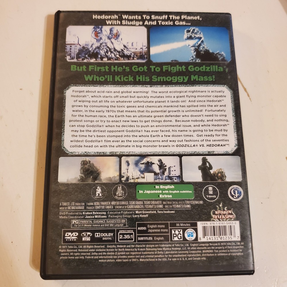 The "Godzilla vs. The Smog Monster (Godzilla vs Hedorah)" DVD released by Kraken Releasing in 2014 features the iconic battle between Godzilla and Hedorah, also known as the Smog Monster. Directed by Yoshimitu Banno, this sci-fi and fantasy film is presented in NTSC video format with English subtitles available. The DVD is housed in a tall/DVD case and is rated G, suitable for all audiences. With a runtime of approximately 85 minutes, this Toho production offers a thrilling showdown between two formidable creatures, making it a must-watch for fans of the Godzilla franchise. * No Returns * * Message me if you want to buy multiple items to combine shipping! * *Please Note: I only ship once a week on Saturdays! If you are buying an item towards the end of the week please make sure you are making prompt payment or you may end up waiting until the following week for your item to ship!*