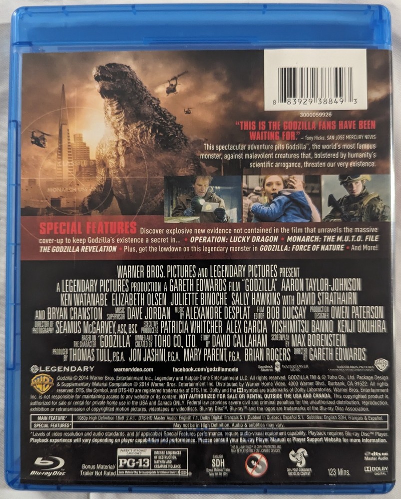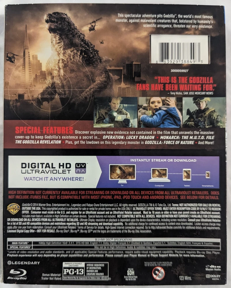Godzilla w/ Slipcover (Blu-ray, 2014). This item is in VERY GOOD condition. DISCS are in GREAT condition with no signs of surface wear. No scratches or anything that affects play. Case shows some very light shelf / handling wear. SLIPCOVER has some minor wear. Digital Ultraviolet Expired. Discs have been tested and are in working order. Be sure to look at all photos. Shipments are made every business day Monday-Friday. Feel free to message me with any questions you have. Thanks very much for looking!