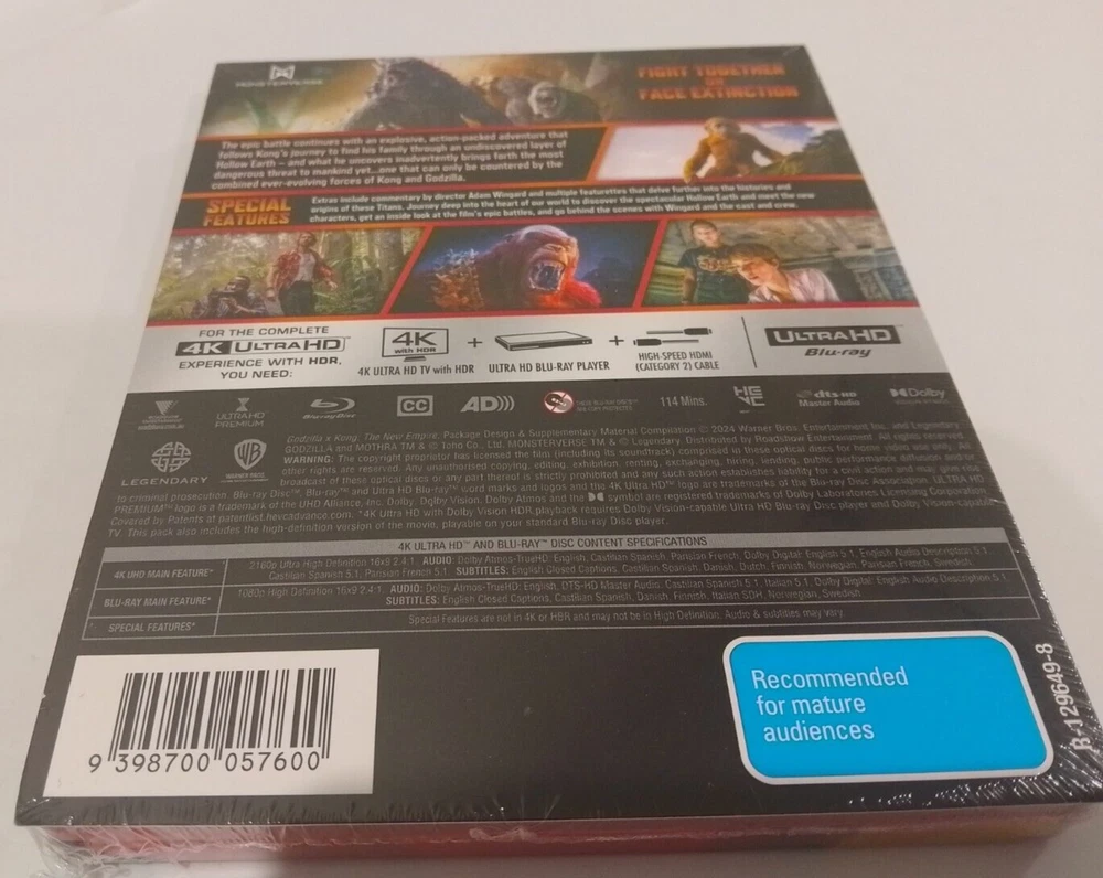 GODZILLA X KONG 4K UHD + BLU-RAY STEELBOOK Experience the ultimate battle between two legendary behemoths with "Godzilla x Kong: The New Empire" in stunning 4K UHD and Blu-ray. This limited edition steelbook collector's set features director Adam Wingard's epic showdown between Godzilla and Kong in a visually stunning and action-packed adventure. Starring Rebecca Hall, Brian Tyree Henry, and Dan Stevens, this 115-minute sci-fi and fantasy thriller is a must-have for any movie collector or fan of the genre. With language options for both English and Italian and region-free compatibility, this set is perfect for fans worldwide. Don't miss out on this pre-sale opportunity to add "Godzilla x Kong: The New Empire" to your collection. BRAND NEW AND SEALED GENUINE REGION B Please check out my store for more great titles. FREE Standard Postage Australia Wide. Once payment is received I will have it away promptly . Please choose postage option at checkout. Standard Post: FREE, 4-12 Working Days, NO Tracking. Express Post: $ 5.00, 1-3 Working Days. Tracking. STEELBOOK will be sent the following day after payment , standard postage to WA & NT & QLD can take up to 12 working days.