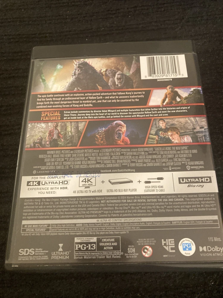 Experience the epic battle between two legendary monsters in Godzilla x Kong The New Empire 4K UHD Blu-ray. This movie, released in 2024, is rated PG-13 and features stunning visuals in 4K Ultra HD format. The edition includes a Blu-ray disc and is brought to you by Warner studio. Get ready to witness the ultimate showdown between Godzilla and Kong, two iconic characters in the world of cinema. This movie is a must-watch for fans of action and adventure. Don't miss out on the opportunity to own this exciting edition. All items will be packed with extra bubble wrap for protection during the delivery process. Steelbooks and blurays with Rare Slipcovers come with a free vinyl protective case that I will ship the item in to prevent any damage in transit. If you are a collector please inspect all items closely; especially Slipcovers, there are no perfectly mint Slipcovers. If so, I have yet to see one. I will note any noticeable flaws in the description if any. Note: for any used or opened items most likely will not come with a digital code or if it is included it may already be redeemed or expired. All items posted are authentic and not bootleg. Smoke free and pet free environment. Items will usually be mailed out within 48 hours of payment. I make trips to the post office everyday with the exception of Sundays or holidays. The shipping delays have been better as of late with USPS, but please be patient as some states have had staffing issues and inclement weather. International Buyers - Please Note (this is standard for ebay): Import duties, taxes, and charges are not included in the item price or shipping cost. These charges are the buyer's responsibility. Please check with your country's customs office to determine what these additional costs will be prior to bidding or buying. As noted I do not accept returns. But I’ve been a trusted seller/collector for several years. My near perfect positive feedback speaks for itself. Feel free to contact me with any questions or concerns. Buy with confidence! I do offer combined shipping for those who live in the United States. It is $4 for the first listing and 50 cents for each additional listing . After you purchase the items you want, I will refund you the difference. Feedback will be given to the buyer after they have received their item and provided me with feedback first. Physical media is getting more and more scarce and harder to find. You better get a copy in your collection before it’s too late! Long Live Physical Media!!!!!!!!!