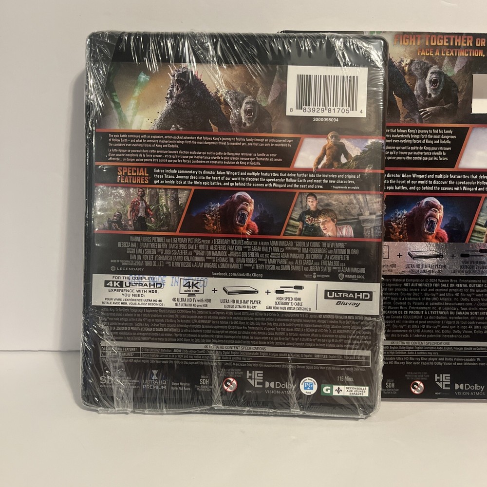 Godzilla x Kong: The New Empire - 4K Ultra HD + Slipcover is a must-have for fans of epic monster battles. Released in 2024 by Warner Bros., this PG-rated film offers thrilling action and stunning visual effects. This new, factory-sealed package includes the highly sought-after slipcover, making it a valuable addition to any DVD & Blu-ray Disc collection. Get ready to experience the ultimate showdown between two iconic titans in crystal-clear 4K resolution. Order yours today and bring home the excitement of Godzilla x Kong: The New Empire.