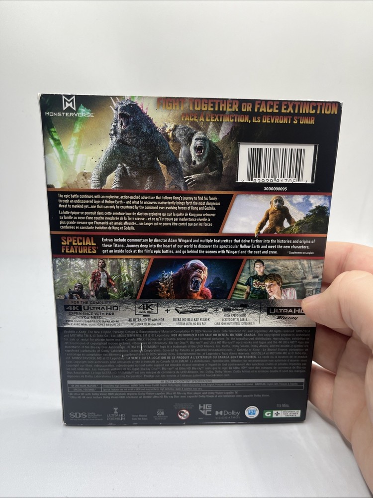 Experience the epic showdown of the century with "Godzilla x Kong The New Empire" in stunning 4K Ultra HD. The latest installment in the monster-versus-mountain saga is brought to you by Warner Bros., ensuring a cinematic experience that's both visually breathtaking and acoustically immersive. This version comes complete with a sleek slipcover and is brand new, factory-sealed for your collecting pleasure. Suitable for a general audience with a PG rating, the film is a 2024 release that promises to deliver thrilling action and captivating storytelling. Whether you're a fan of the franchises or simply love a good disaster-scale spectacle, this movie is poised to be a memorable addition to your home cinema collection.