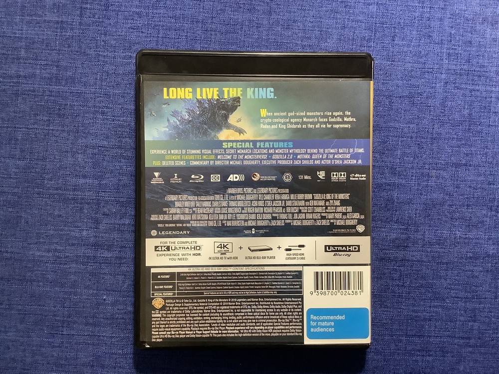 Experience the ultimate monster showdown with Godzilla-King of the Monsters on 4K UHD Blu-ray. This action-packed film features an all-star cast including Millie Bobby Brown, Vera Farmiga, and Ken Watanabe. Directed by Michael Dougherty, the film boasts stunning visual effects and a heart-pumping score. The Blu-ray + Uhd combo includes the film in stunning 4K resolution, as well as special features like deleted scenes and behind-the-scenes footage. With a runtime of 131 minutes and a rating of M, this is a must-have for any action and adventure fan. Like new and region B compatible, this is a great addition to your movie collection.