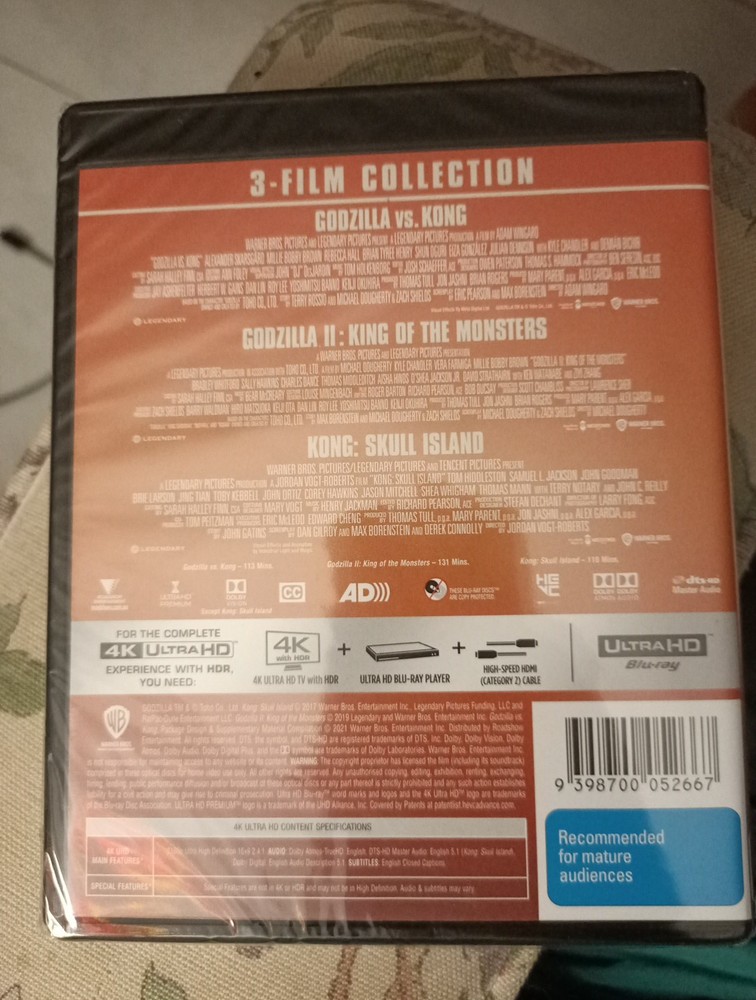 Brand new and sealed Get ready for epic monster battles with the Godzilla/Kong 4K UHD: 3-Film Collection. This box set features three action-packed films - Godzilla vs. Kong, Skull Island, and Godzilla: King of the Monsters. Directed by Adam Wingard, Jordan Vogt-Roberts, and Michael Dougherty, this collection promises thrilling sci-fi and fantasy entertainment. With a star-studded cast including O'shea Jackson Jr., Millie Bobby Brown, and Alexander Skarsgård, this Blu-ray edition in 4K UHD is a must-have for any movie enthusiast. Get your hands on this Warner Studio release from 2021 and immerse yourself in the world of giant monsters and epic battles.