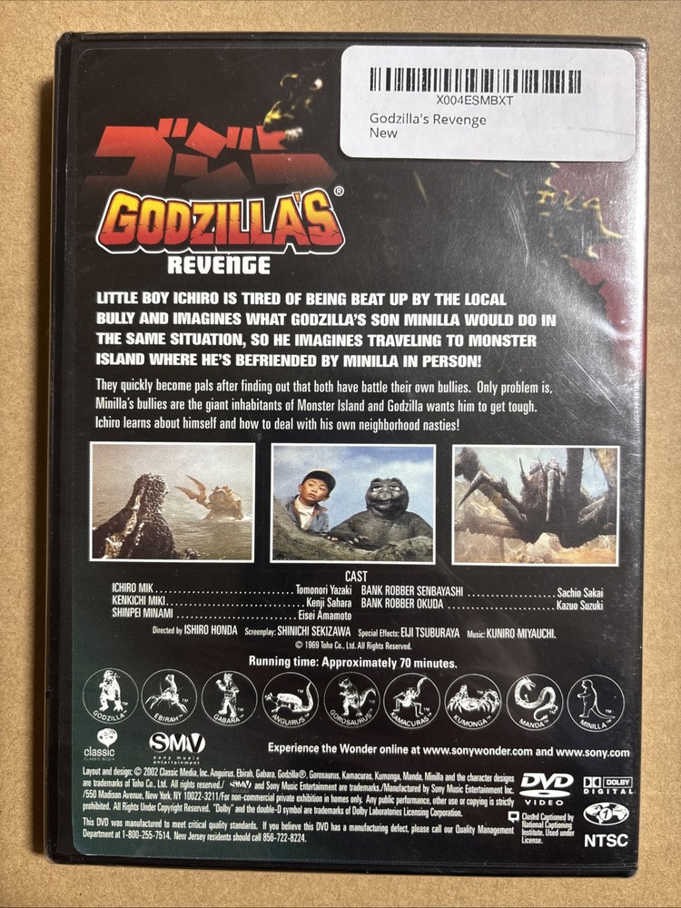Get ready to witness the ultimate battle between Godzilla and his opponents in "Godzilla's Revenge" DVD. This brand new, factory-sealed DVD features the legendary creature and his foes in an epic showdown that will leave you on the edge of your seat. With a rating of G, this Sci-Fi & Fantasy movie is suitable for all audiences. Directed by Ishiro Honda and Inoshiro Honda, this movie also features Kenji Sahara as the main actor. The release year of this DVD is 2002, and it falls under the Sub-Genre of Aliens. This DVD is a must-have for all movie lovers who are fans of monsters and fantasy. Don't miss out on the chance to own a copy of "Godzilla's Revenge" and experience the thrill of the battle.