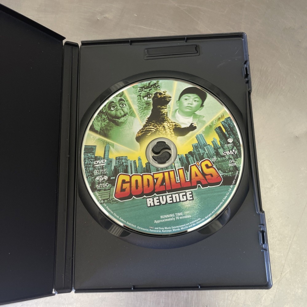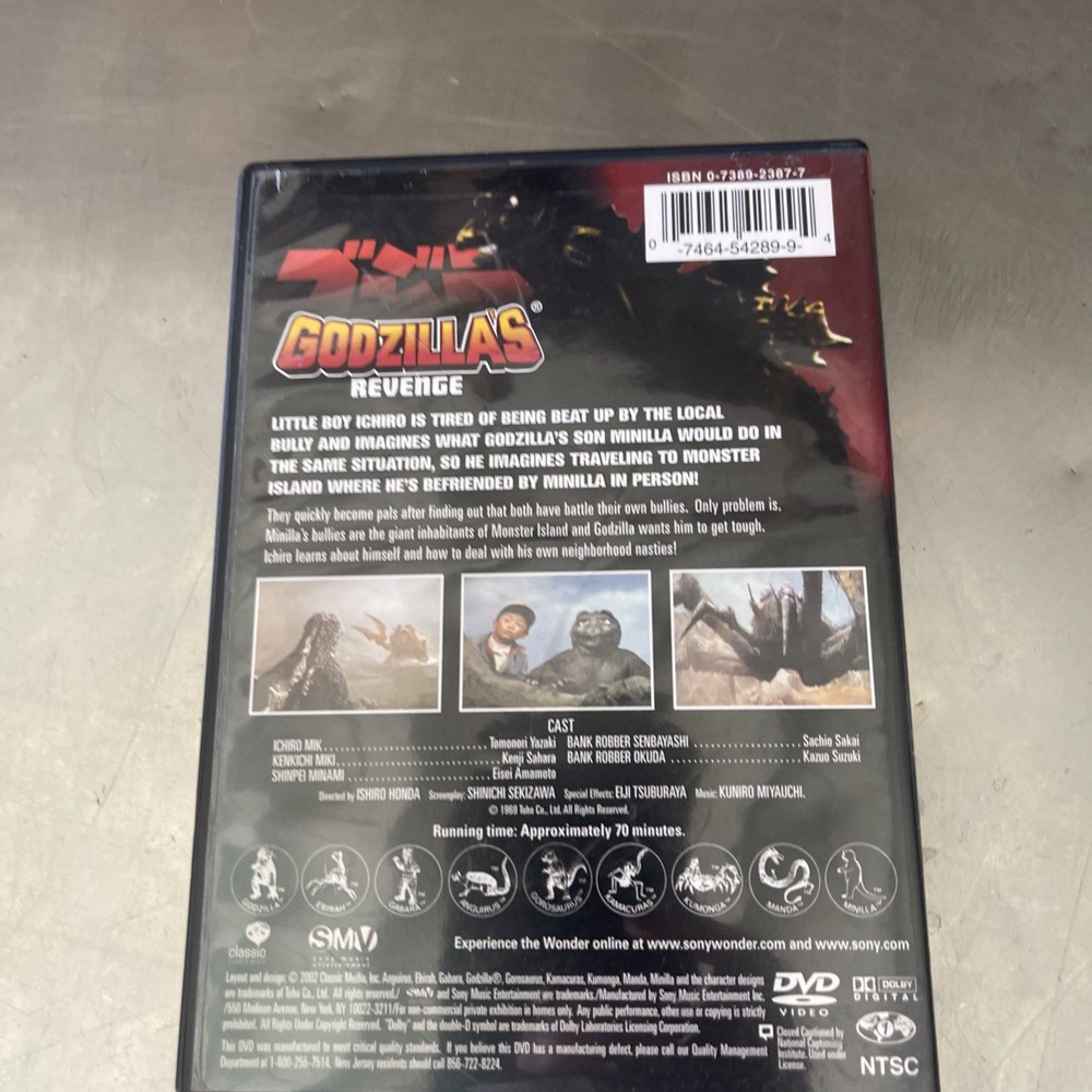 This DVD features the epic battle between Godzilla and his counterparts in "Godzilla's Revenge". Released in 2002 and directed by Ishiro and Inoshiro Honda, this Sci-Fi and Fantasy movie will keep you on the edge of your seat. The DVD is in very good condition and is rated G, making it suitable for all ages. Starring Kenji Sahara, this movie is a must-watch for any Godzilla fan. Add it to your collection today!
