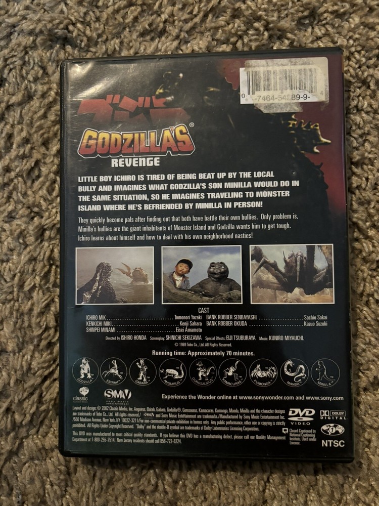 Get ready for an epic showdown with Godzilla's Revenge on DVD. This thrilling movie is a must-watch for fans of the iconic monster, and it's now available in DVD format for your convenience. Join Godzilla in his battle against the evil forces of Blackbird and his friends, and witness the devastating destruction that ensues. This DVD is perfect for collectors and fans of the Godzilla franchise, and it's a great addition to any movie collection. Don't miss out on the chance to own this exciting movie and experience the action and drama of Godzilla's Revenge. Order your copy today and get ready for an unforgettable viewing experience