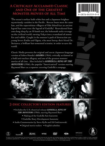 Product Description This package contains: * Godzilla (1954 Japanese Edition-english subtitles) * King of the Monsters (1956 U.S. Release Edtion-english v/o dub) Featuring: * Audio commentaries * Original trailers *"Making of the Suite" Featurette *"Godzilla: Story Development" featurette The first of the Godzilla movies, and the most somber and serious in tone, Gojiro was originally a 98-minute Japanese horror film, until a U.S. company bought the rights and reissued the film at 79 minutes, replacing sequences involving a Japanese reporter with new inserts of a dour, pipe-smoking Raymond Burr. Both versions appear together for the first time in this release from Sony Wonder. Stills from Gojiro (click for larger image)