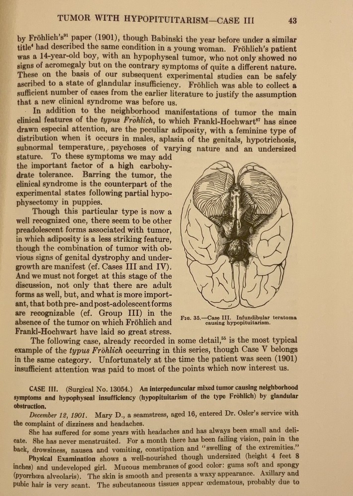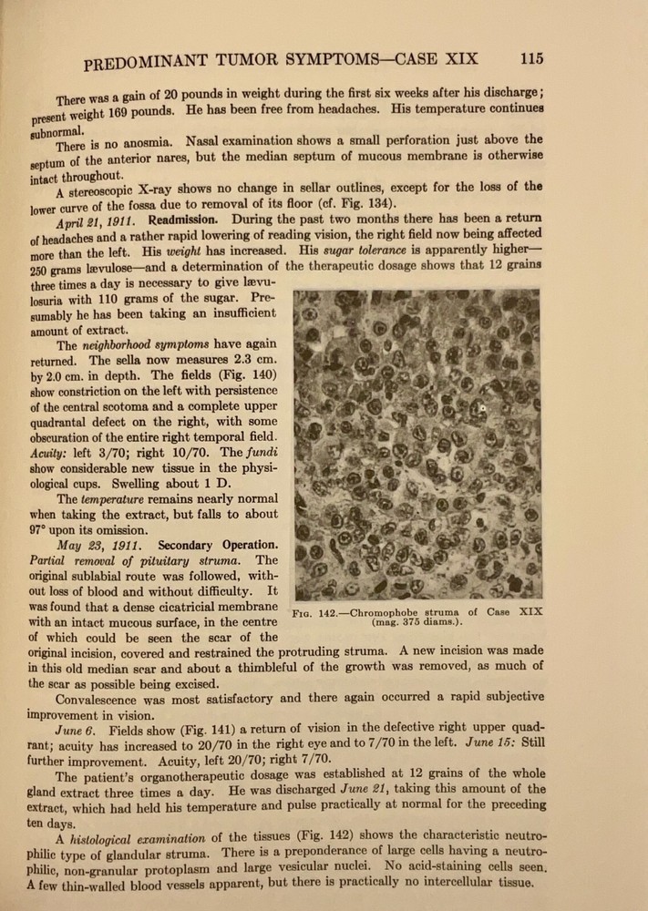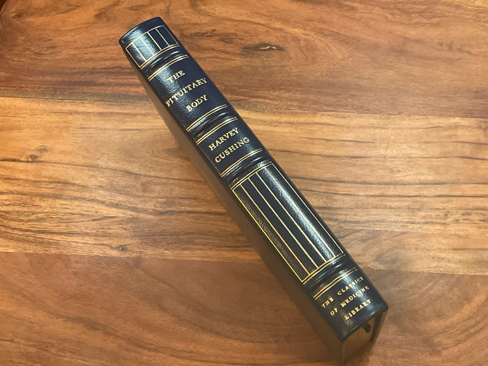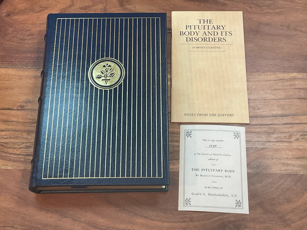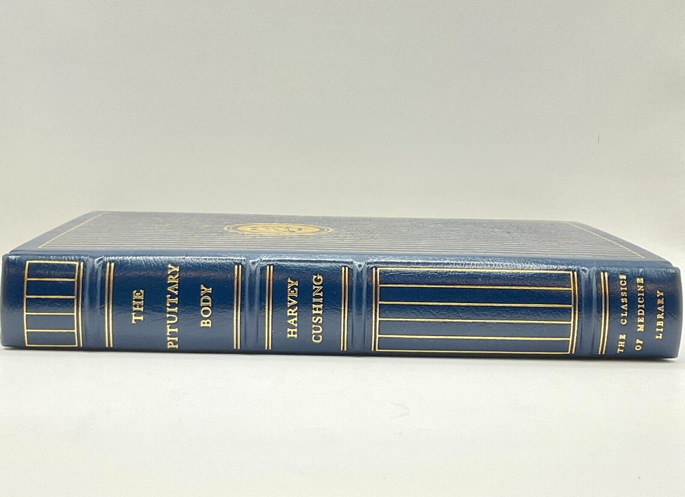 Described as the "Leonardo Da Vinci" of surgery, Dr. Harvey Cushing was a celebrated clinician, surgeon and professor at Harvard University. As his first book, "The Pituitary Body and Its Disorders' was first delivered as a lecture in New York in 1910. This expanded edition expands on the original lecture and includes many illustrations which were unique to the format at the time. Published as part of the Classics in Medicine Library by Gryphon Editions, Octavo (7" x 10") full leather with gilt designs on covers and spine. Hubbed spine with five compartments, three with writing. silk moir endpapers. Re-creation of the original title page, and inclusion of the original plates, both grayscale and color. Printed on acid free paper with gilt edging; includes silk bookmark sewn into binding. Excellent condition with no signs of wear, smudhing, or foxing. This listing includes the original letter, publisher notes, and postcard. This copy is #1939 of a numbered printing.