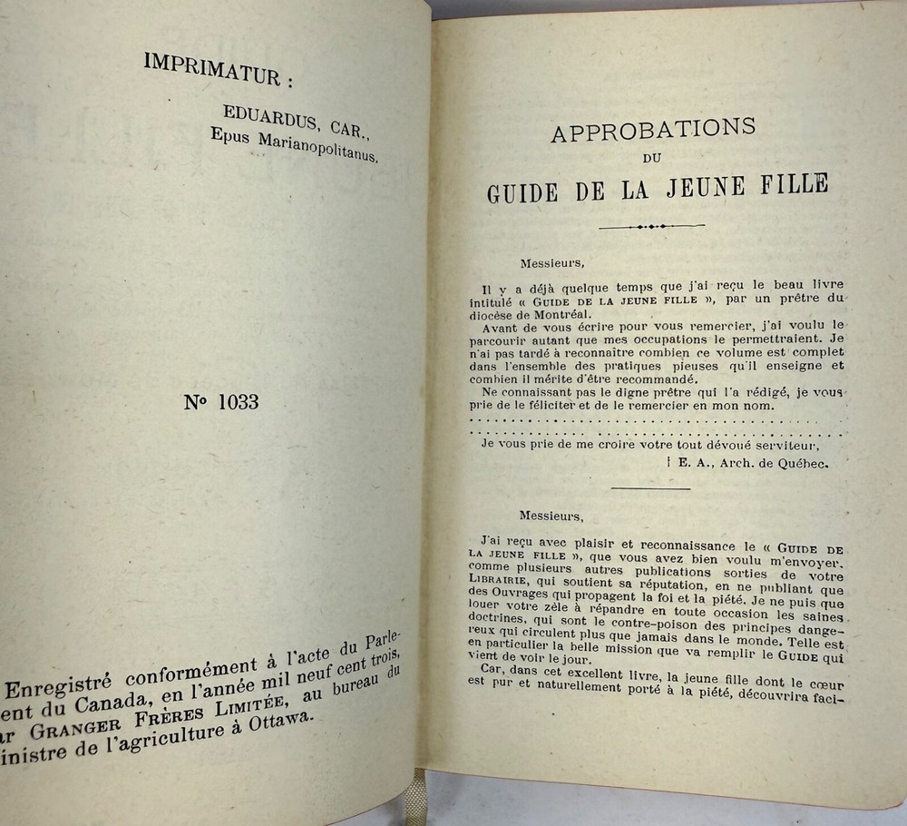 Guide de la Jeune Fille 1921 Douzieme Edition G.F.L. Libraires Catholiques French Language Made in France Book is entirely in French Language as can be seen in pictures. Leather bound book is from 1921, completely intact. Page 16 has some staining as shown in pictures, pages are otherwise clean and free of marks. Nice book! Small book, see pictures for measurements. I ship within 24 hours of payment received. Seller's Notes: B1
