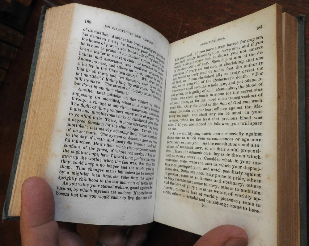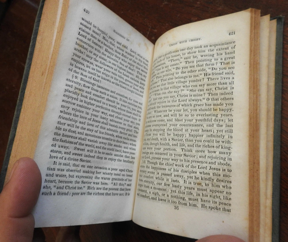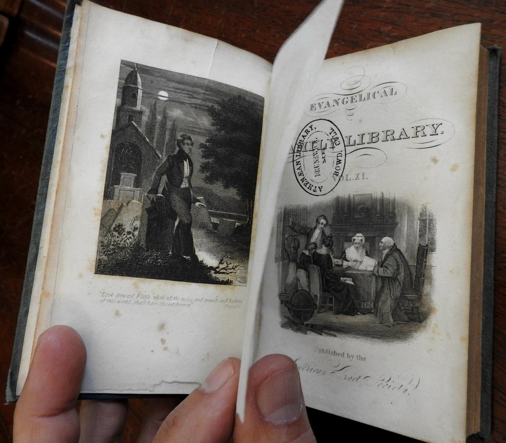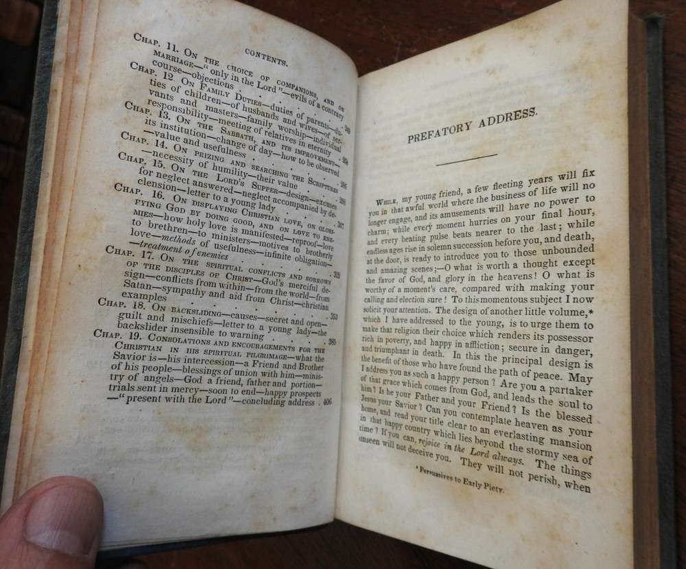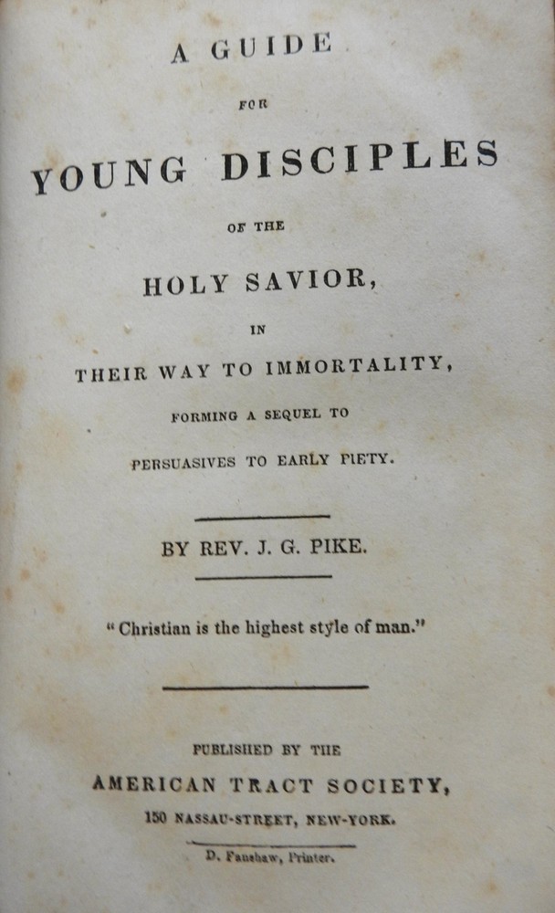 Guide for Young Disciples of the Holy Savior 1823 Pike ATS leather book Guide for Young Disciples of the Holy Savior 1823 Pike ATS leather book (Old Books, 19th Century Book, Leather Books, Religion, Christianity). A Guide for Young Disciples of the Holy Savior in Their Way to Immortality, by J.G. Pike. Published c. 1823, New York by the American Tract Society. 465 pages. Text in English. Richly engraved frontis & half title protected by original tissue guard. Frontis depicts an elegantly dressed man contemplating in the moonlight night, half title an extended family interior scene with children before a bookcase full of books. Publishers period 1/4 leather binding, early cloth covers, smooth spine, gilt title lettering & bands, old institutional paper label on spine. Book is physically old (almost 200 years old to be precise) and shows some mostly gentle signs of handling and time. Book is not new or in "new" condition, but it does survive much nicer than is typical for other books of this era. Looks nicer in person than screen pics might indicate. Binding gently age worn, leather rubbed with some old thin spine creasing, but still supple, joints slightly scuffed, remains overall attractive as an object. Text block paper is gently toned, light to moderate scattered age spotting, internally still well preserved, tight, sound. Still attractive on the shelf. Book displays a pleasing and unique age patina and is in nice antiquarian condition, any age flaws easy to overlook or forgive. Please review photos for more detail and our best attempt to convey how this antique item survives. Book Measures c. 6" H x 3 3/4" W. [B2636].