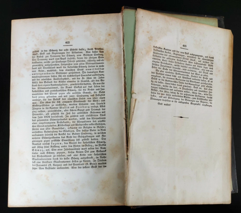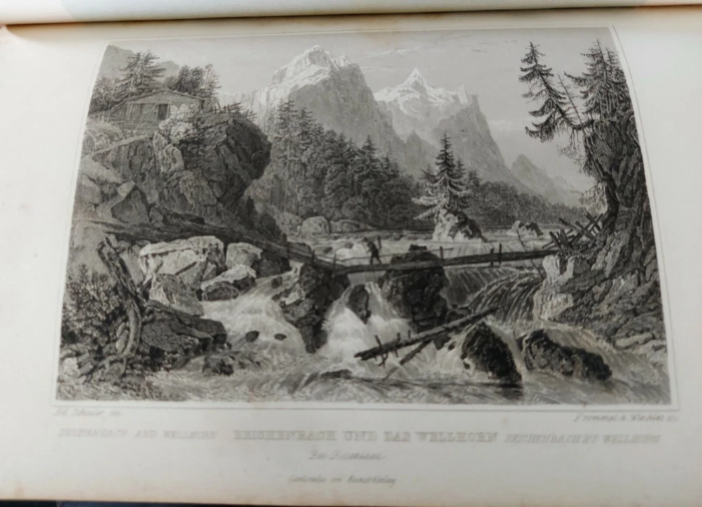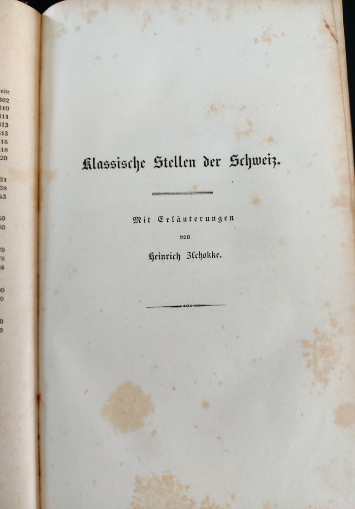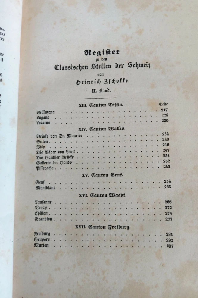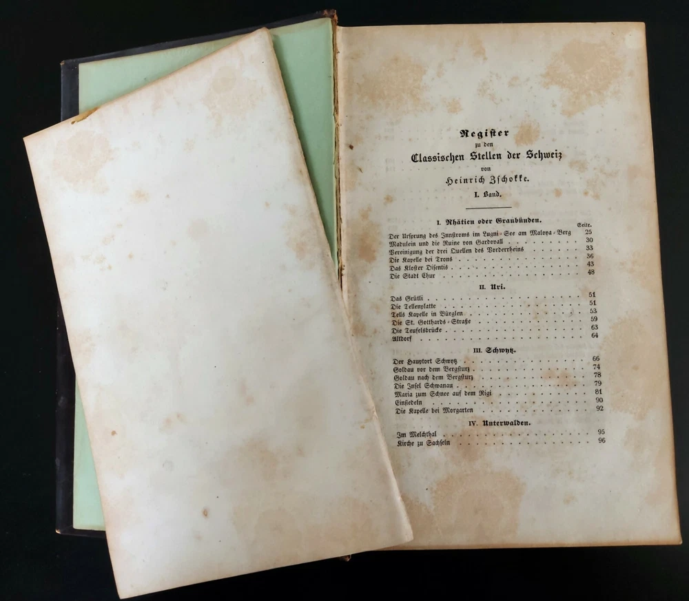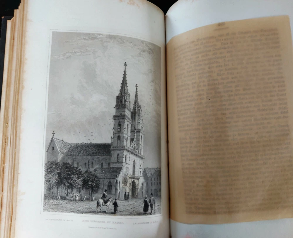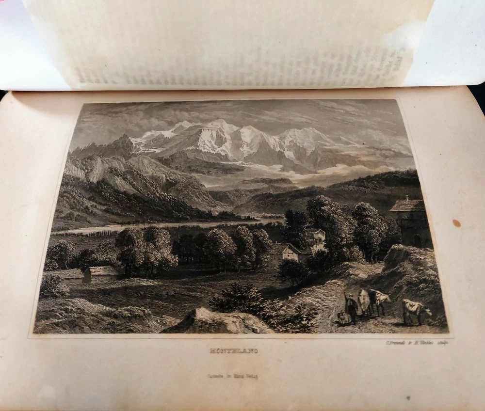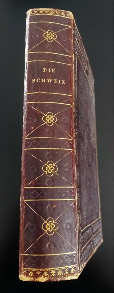 Author: Heinrich Zschokke Title: Die klassischen Stellen der Schweiz / Classic bodies of Switzerland - 2 parts in one voll. Publisher: Carlsruhe, Kunst-Verlag 423p 24,5 x 16 cm 1100 g USED - GOOD CONDITION - Leather binding,with gold embossing, with engraved title and 85 steel engravings, pages edge gilded - age marks are visible - the cover is slightly worn, the pages turned brown in several places, with brown spots in places - first and last pages parted from inner hinge -3 membranes paper are missing - SEE PHOTOS