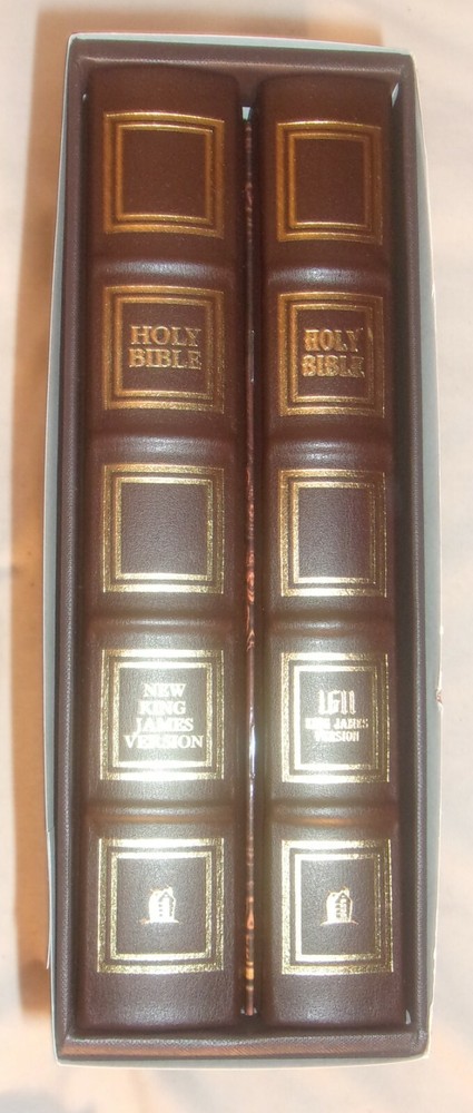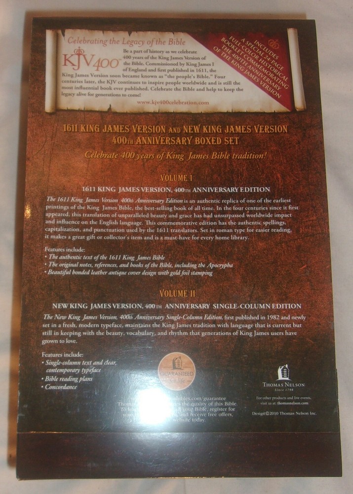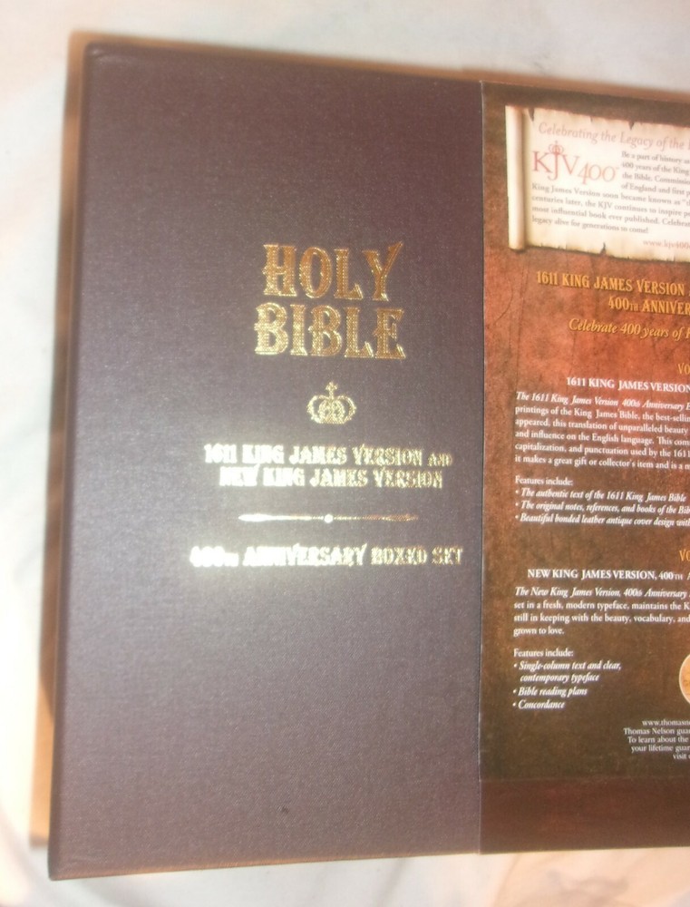 Holy Bible King James Version, 400th Anniversary Boxed set, 2 books with brown bonded leather covers in a slip case.This set is new and the books are nice and never used.The paper wrapper has some light wear on the edges.Nice books to give as a gift or read. Pay-pal is the only accepted form of payment. Items are sold as is, so please read the item description for the condition of the item.Payment is expected within 3 days of auction end. Please allow USPS shipping rules for item to reach you.Usually within 7-10 days for parcel post or quicker for priority mail.Items are sold as is, please read the item description.No returns on this item.Please e-mail me with any questions.Thank you. On Jul-25-14 at 14:26:07 PDT, seller added the following information: Track Page Views With Auctiva's FREE Counter