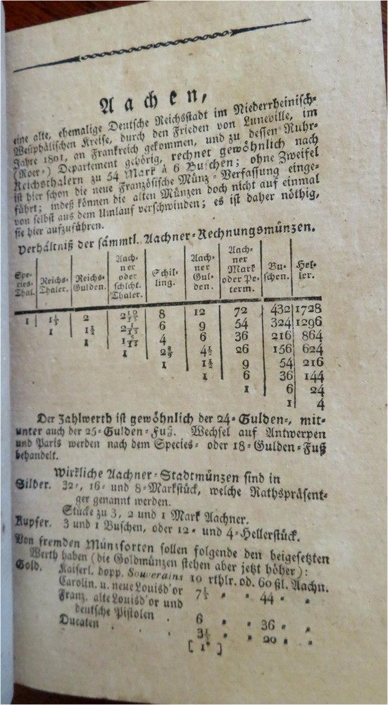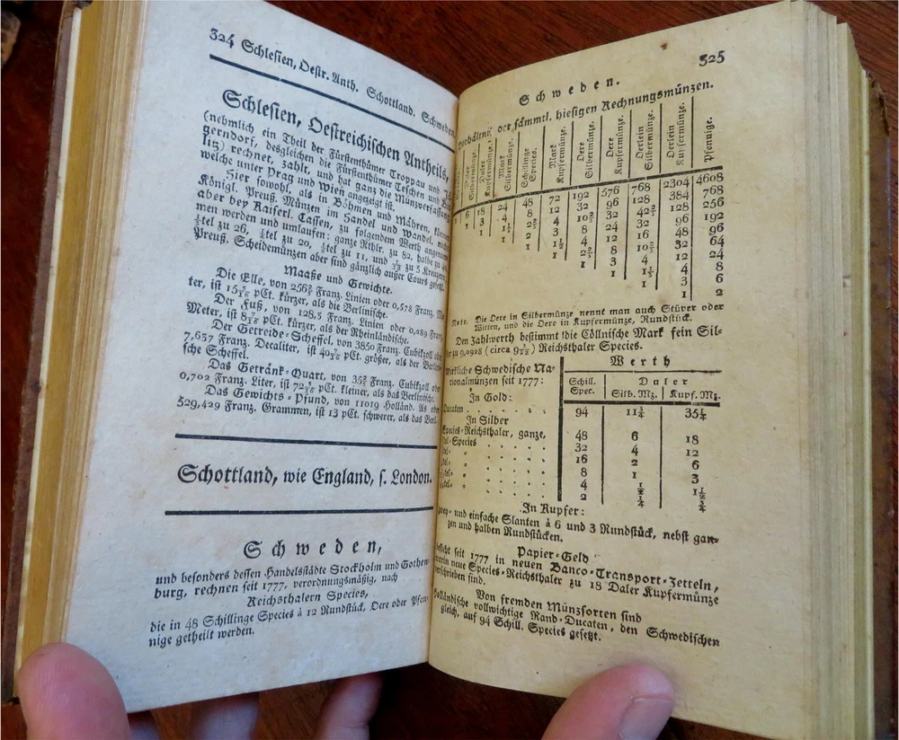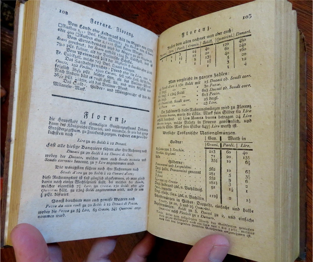 Handbook for Merchants Exchange Rates Shipping Information 1810 leather book Handbook for Merchants Exchange Rates Shipping Information 1810 leather book (Old Books, 19th Century Books, Leather Books, German Books, Merchants). Taschenbuch fur Minz-, Maas-, und Gewichtskunde fur Baquiers und Kaufleute. Published 1810, Berlin by J.S. Sander. 516 pages. Text in German. The main emphasis appears to be on money conversion rates for merchants and bankers in many cities across Europe. Attractive antiquarian full tree leather binding, smooth spine, gilt bands, gilt title lettering on contrasting red leather label. Book is physically old and shows some signs of handling and time. Binding age worn but still appealing, leather and joints scuffed but still supple, top edge of rear cover chewed down 1/4" with loss of tip, some small loss at spine head (related), book remains overall very attractive as an object. Text block paper is gently age toned as typical, internally book remains mostly clean, tight and sound. A book which has been taken care of but may/ does not look like new. Still attractive on the shelf. Book displays a pleasing and unique age patina and is in rather nice antiquarian condition, any age flaws seem easy to overlook or forgive. Please review photos for more detailed attempt to present this book as it survives. We often over-describe any flaws that many sellers would not even bother to mention since most people would overlook them as minor and unworthy of comment. Many people tell us the books they receive from us are nicer in person than they appears on the screen. We want you to be clear about what you are buying, so we take numerous photos and try to describe it openly and honestly. Book Measures c. 6 3/4" H x 4" W. [B6939].