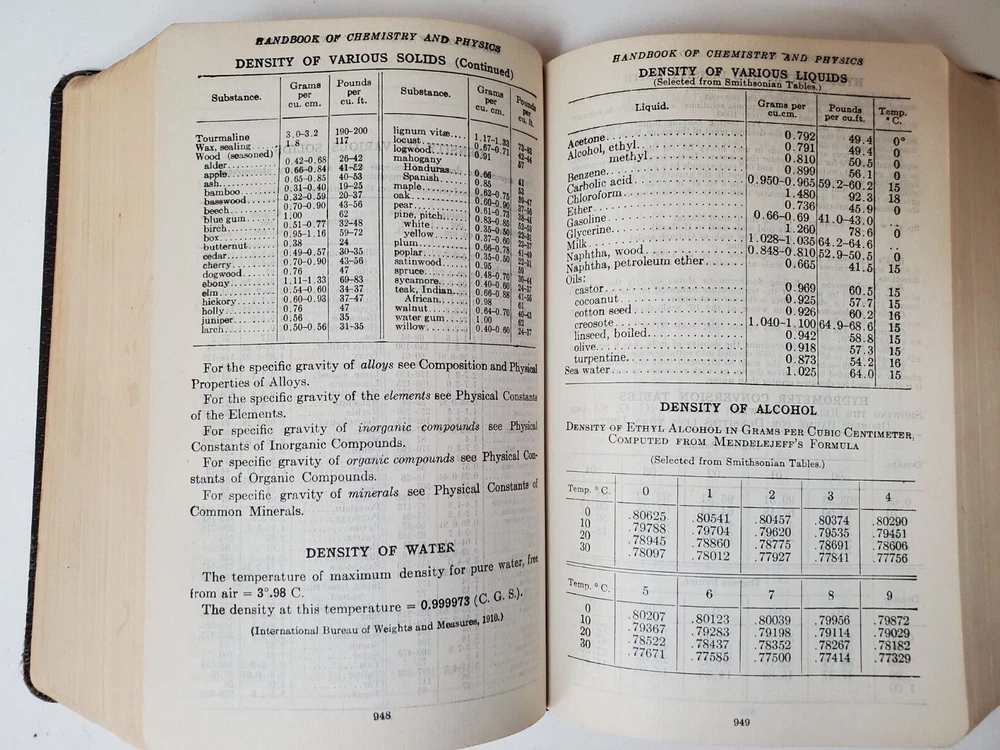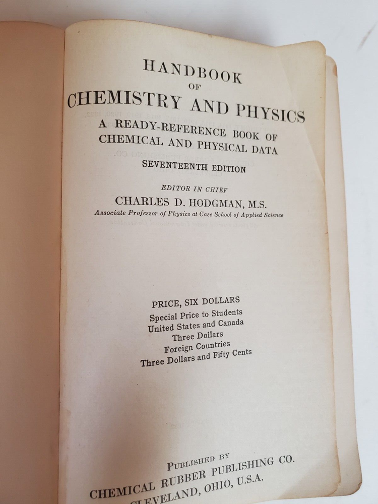 Leatherbound Handbook of Chemistry and Physics, Seventeenth Edition (1932). Former high school library name in pencil on first page. Empty library checkout slip inside front cover. No markings within the pages of the book. (It didn't seem to get checked out, so it's in great shape.) Free shipping via USPO media mail (US only). 14 day return if book is received back in same condition as shipped. Buyer pays return shipping. PCAS 2023