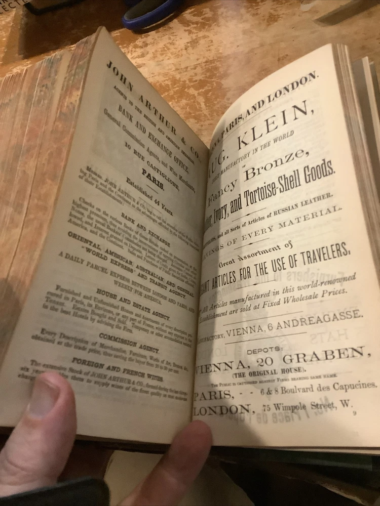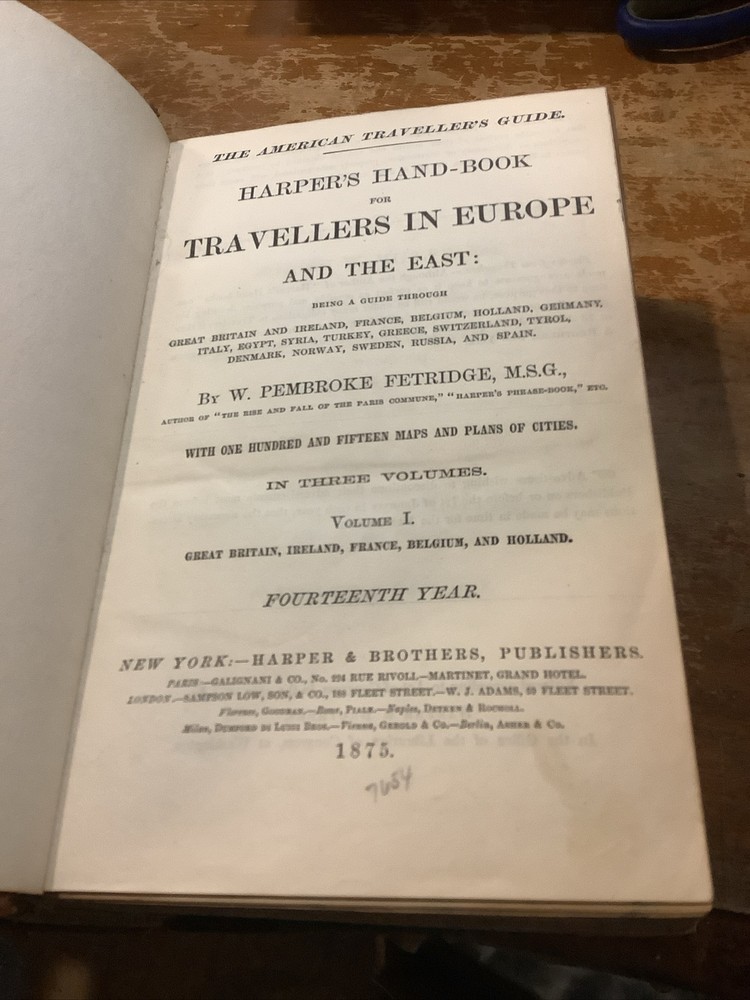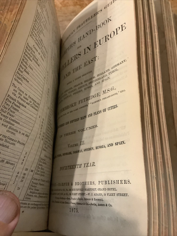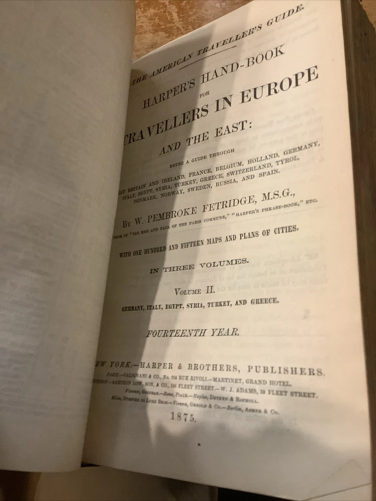 Three volumes of Harper's Handbook for Travellers in Europe and the East bound together in a single volume. Three quarter leather binding. Wear to leather, rubbing, tear to edge. Published in 1875. Lots of black-and-white maps. Lots of ads at the end.