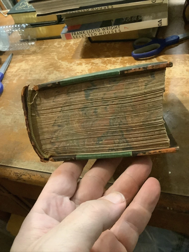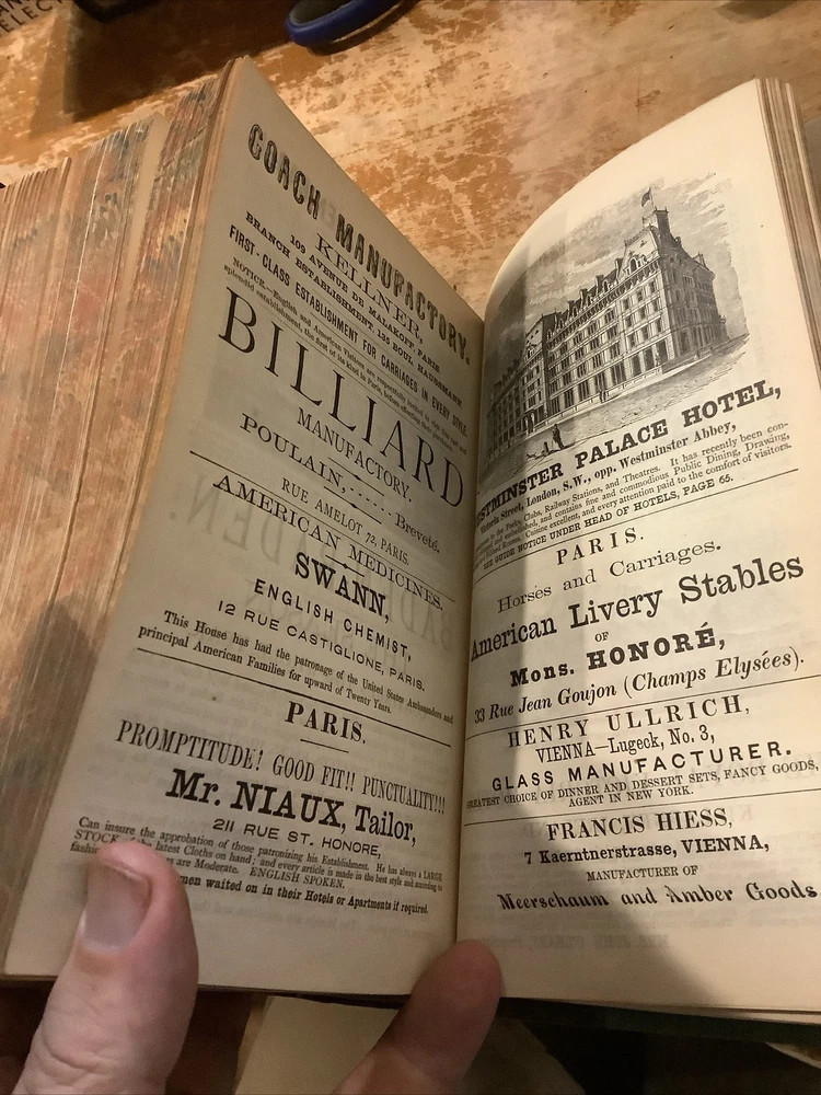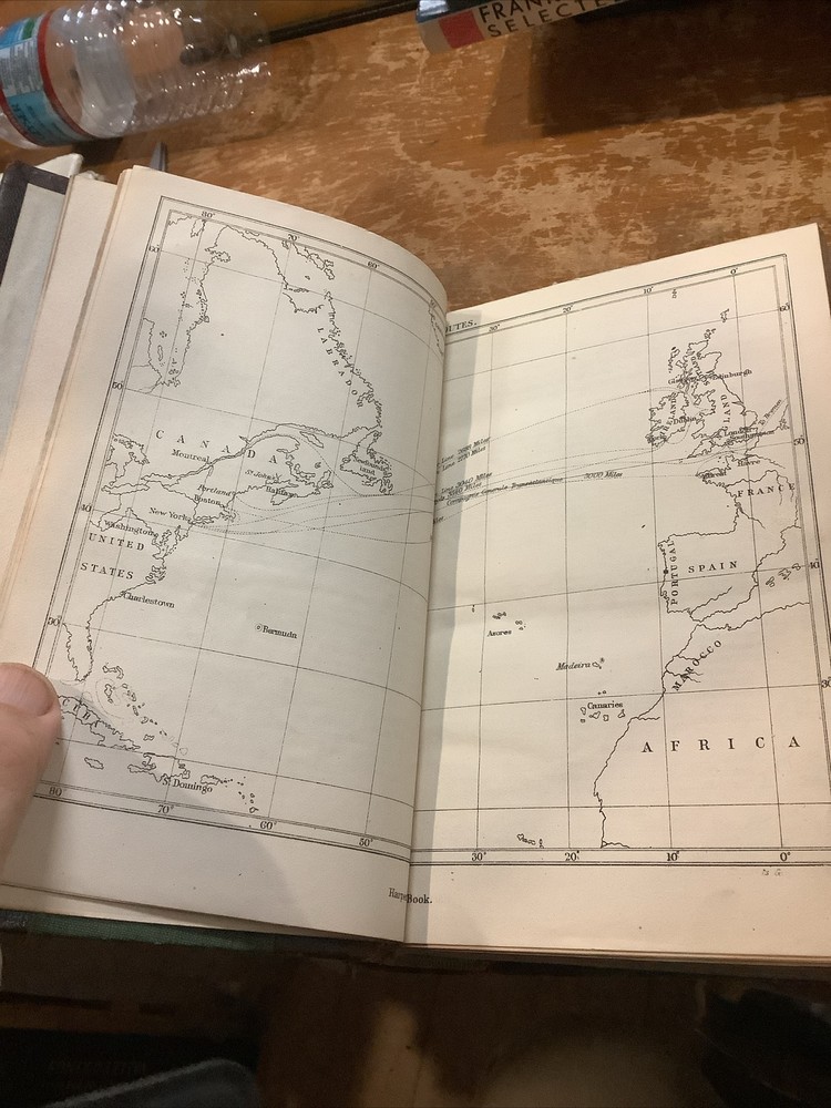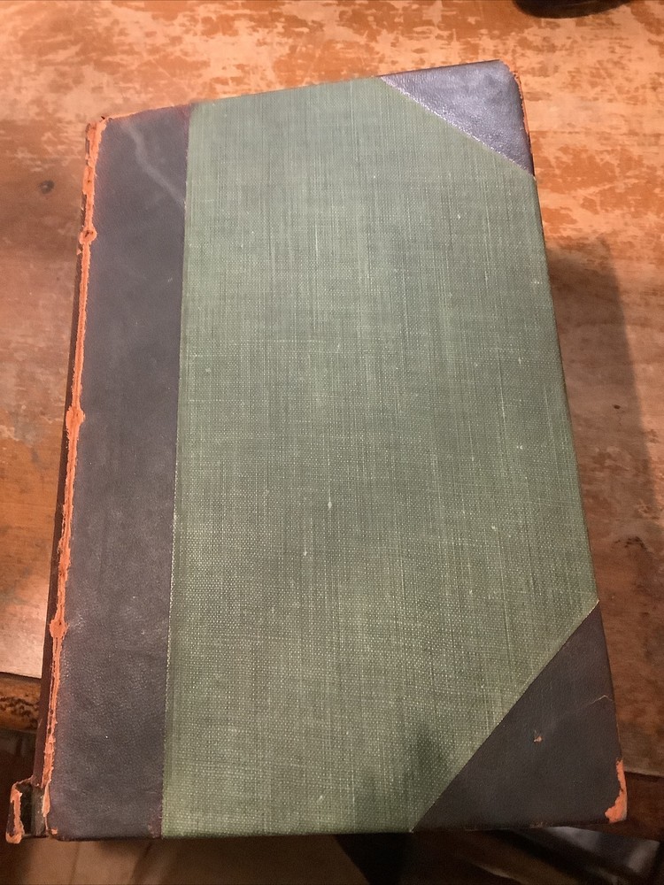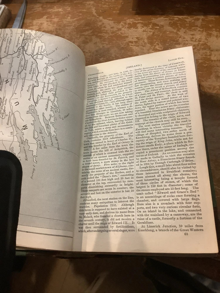 Three volumes of Harper's Handbook for Travellers in Europe and the East bound together in a single volume. Three quarter leather binding. Wear to leather, rubbing, tear to edge. Published in 1875. Lots of black-and-white maps. Lots of ads at the end.